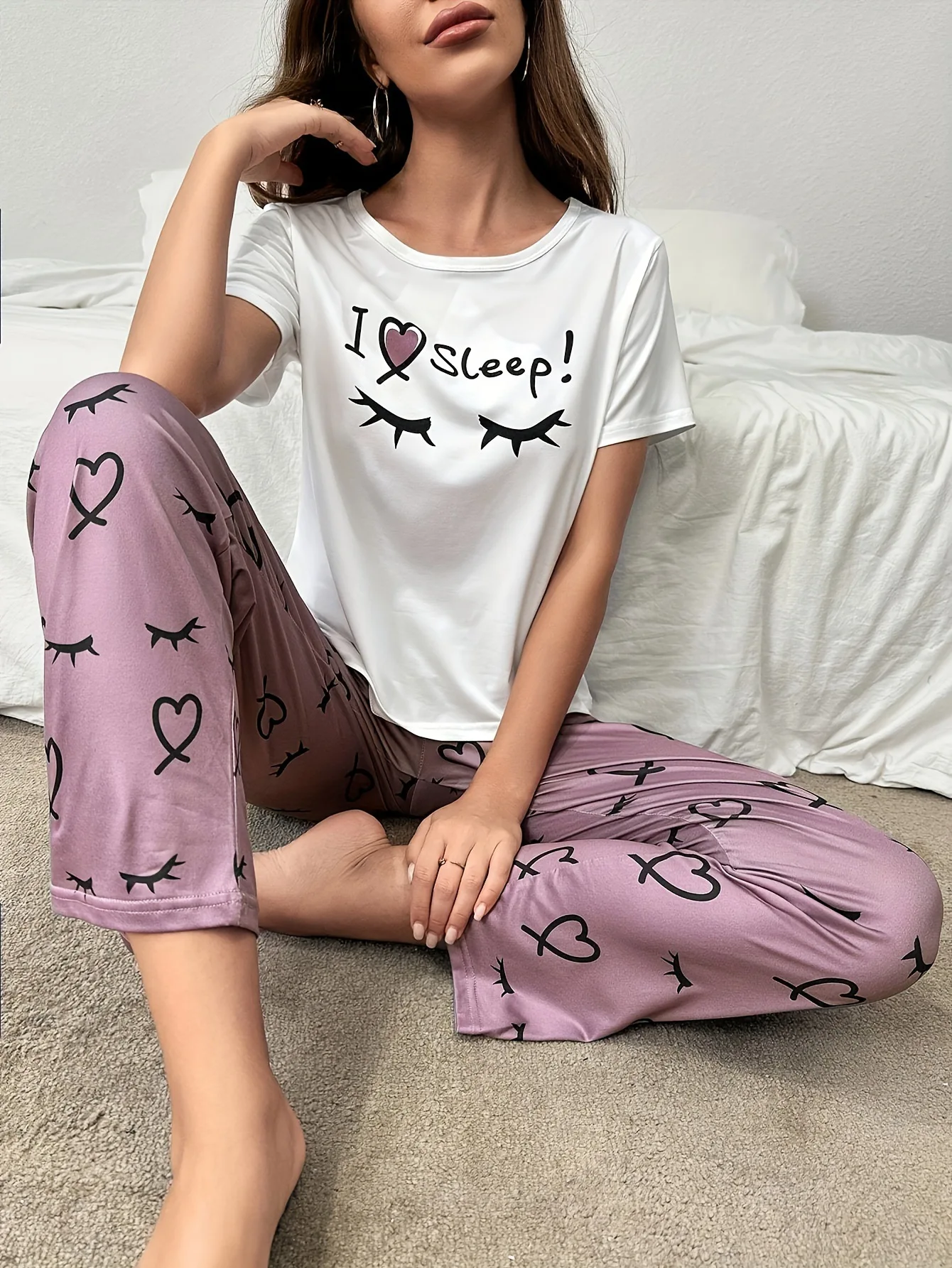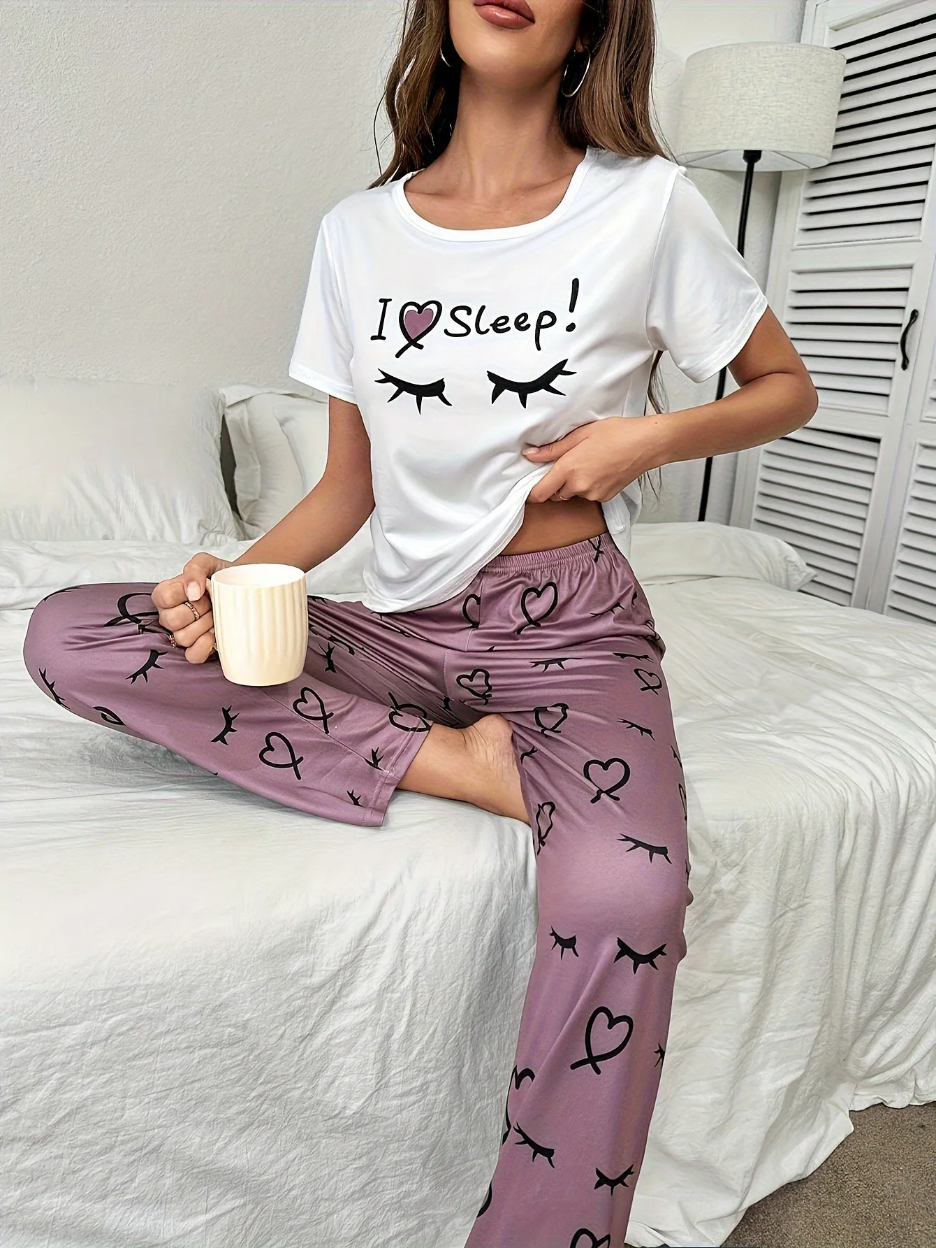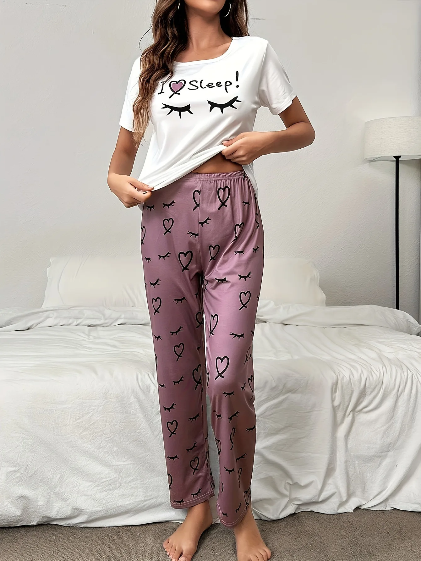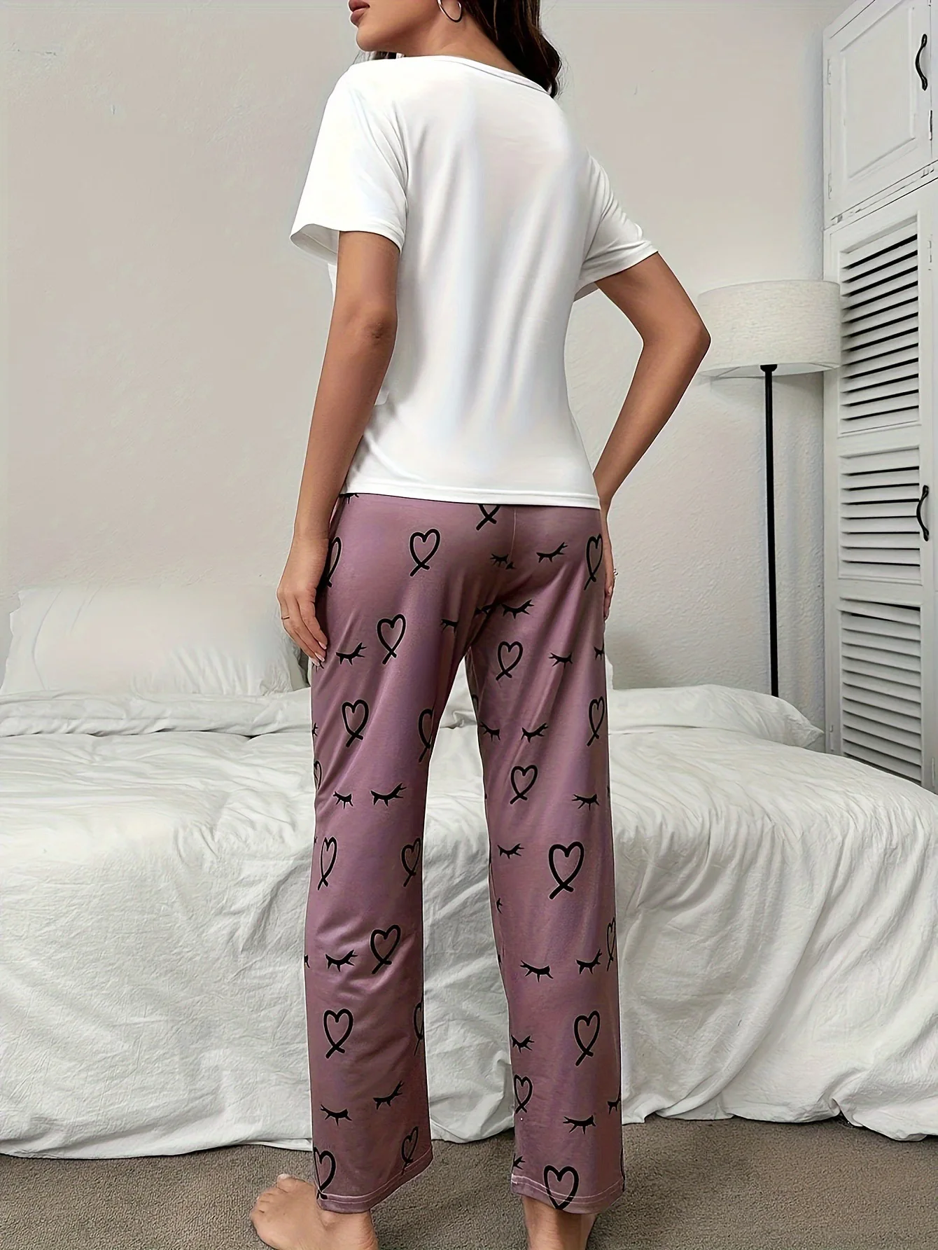 European American Soft Comfortable Casual Pullover Heart Eyelash Print Homewear Long Pants Set