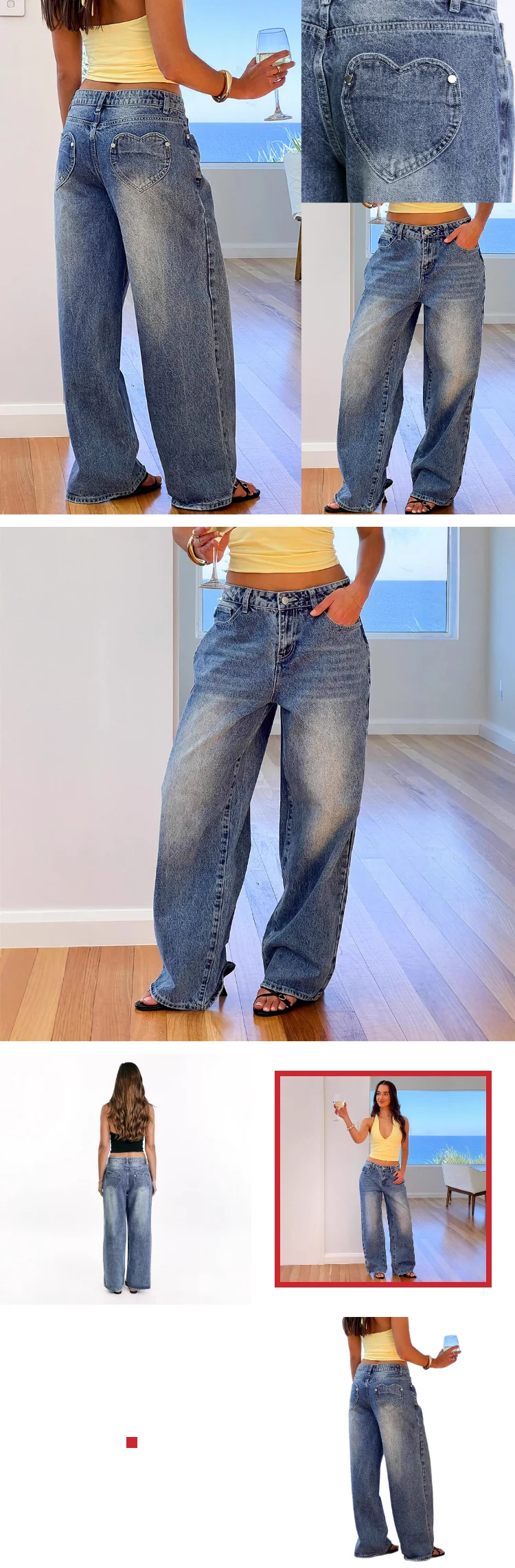 New Vintage Washed Jeans Women's Heart Embroidered Back Pocket Loose Wide Leg Trendy Baddie Denim Pants