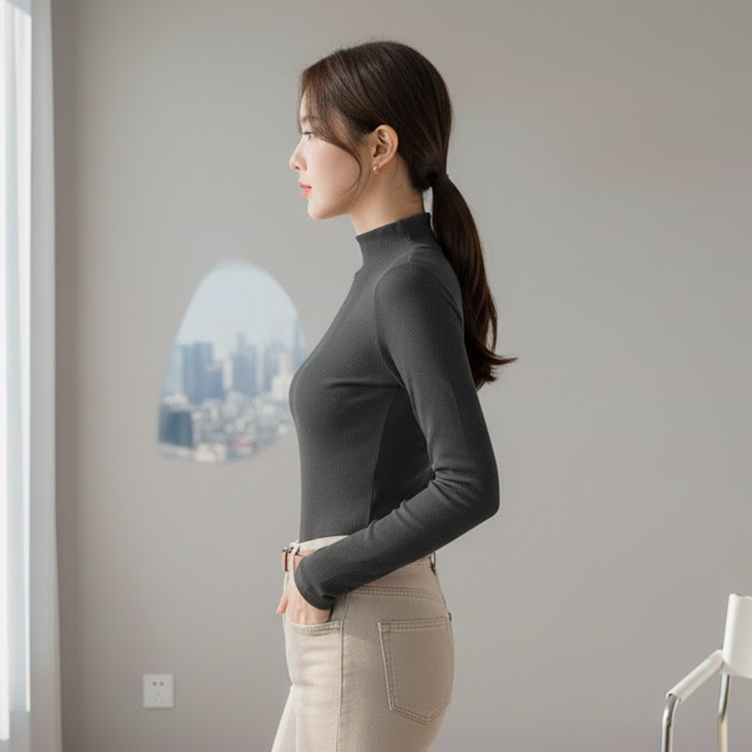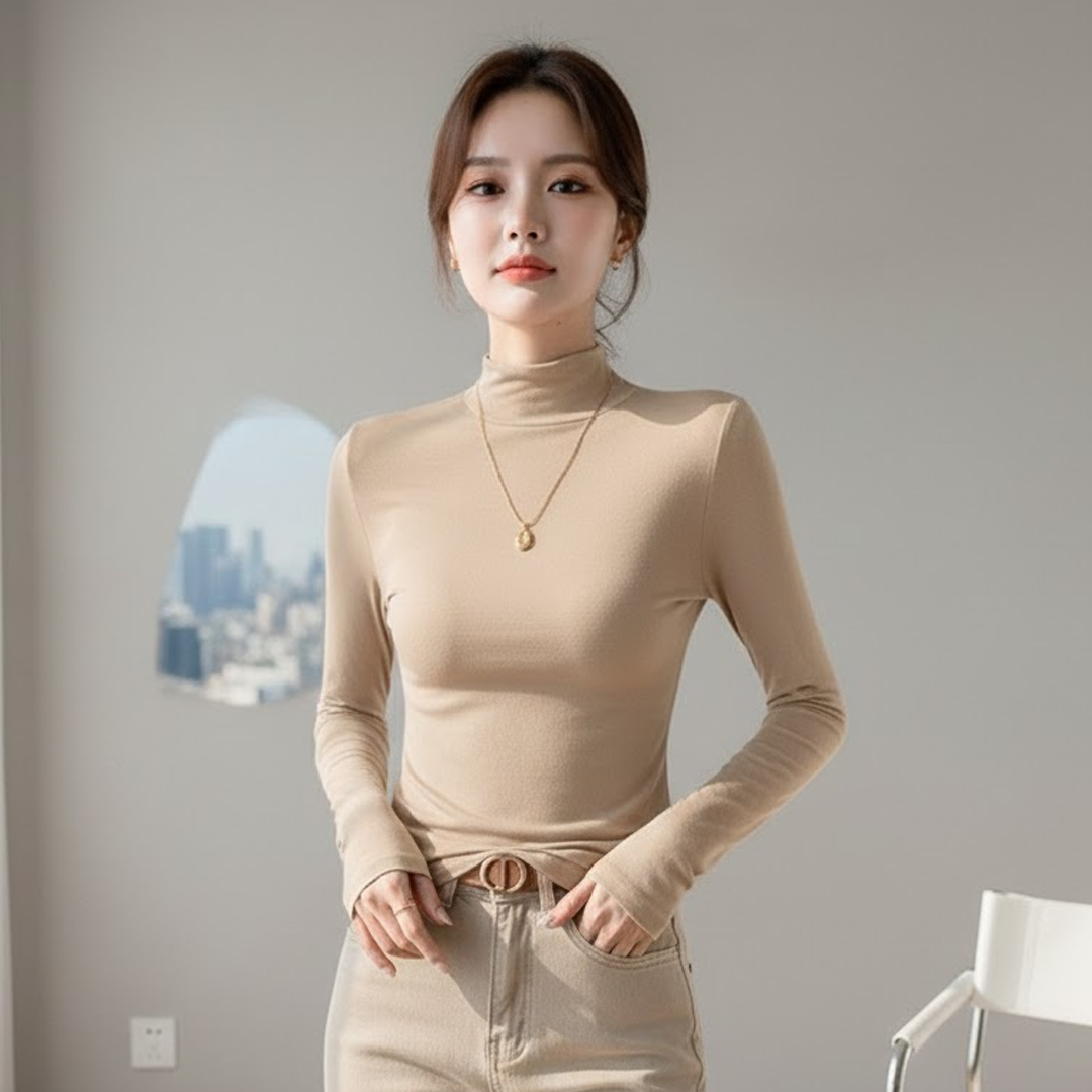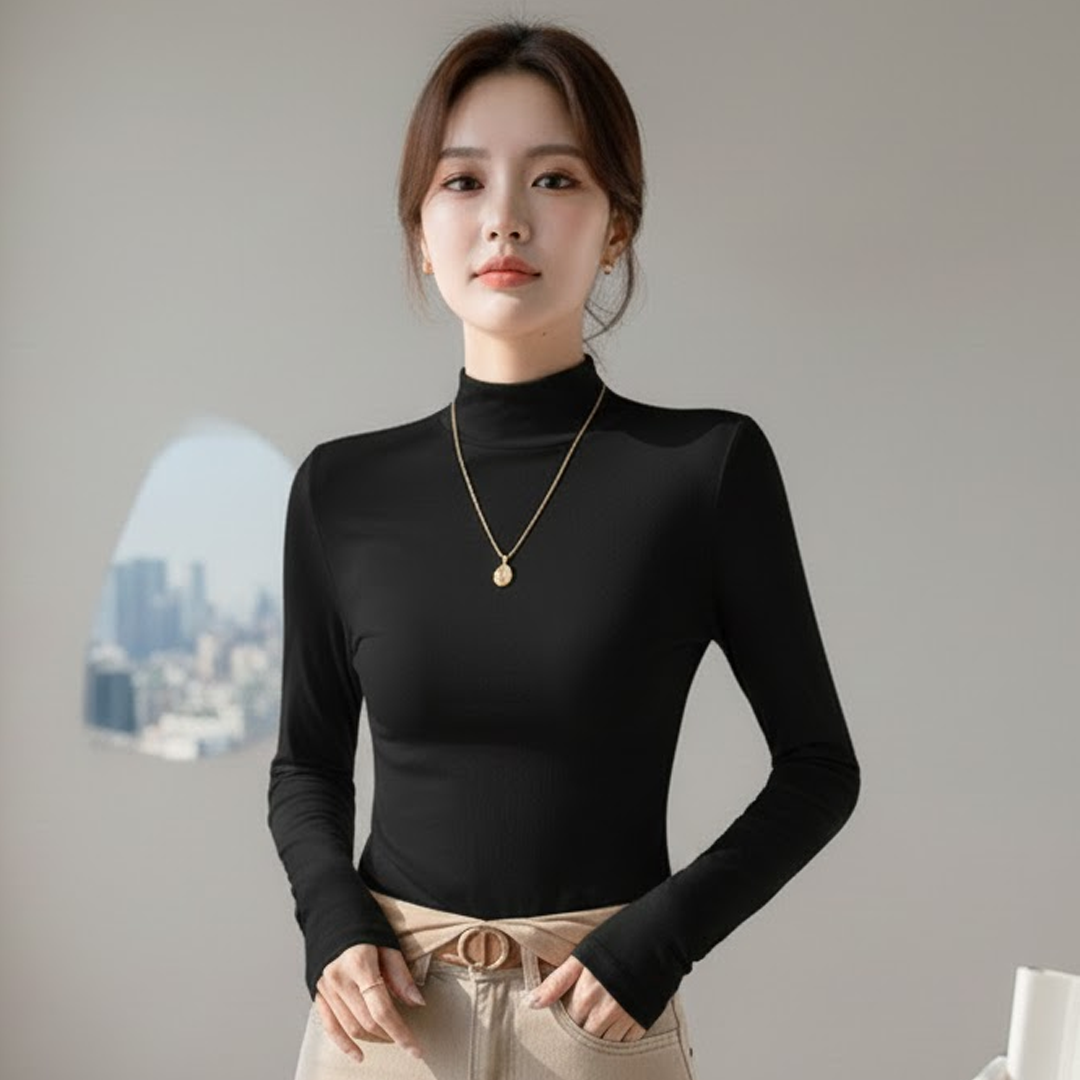 This essential long-sleeve top is designed for warmth, comfort, and versatile layering during cooler seasons. It features a soft, high-stretch fabric that offers a snug, comfortable fit, acting as a smooth second skin. The top has a classic mock turtleneck collar, providing extra warmth and a sleek, elevated look under jackets or sweaters. Available in a range of muted, foundational colors (as seen in the image), it is perfect for seamlessly integrating into any wardrobe. This thermal base layer is a cold-weather must-have for discreet warmth without added bulk.