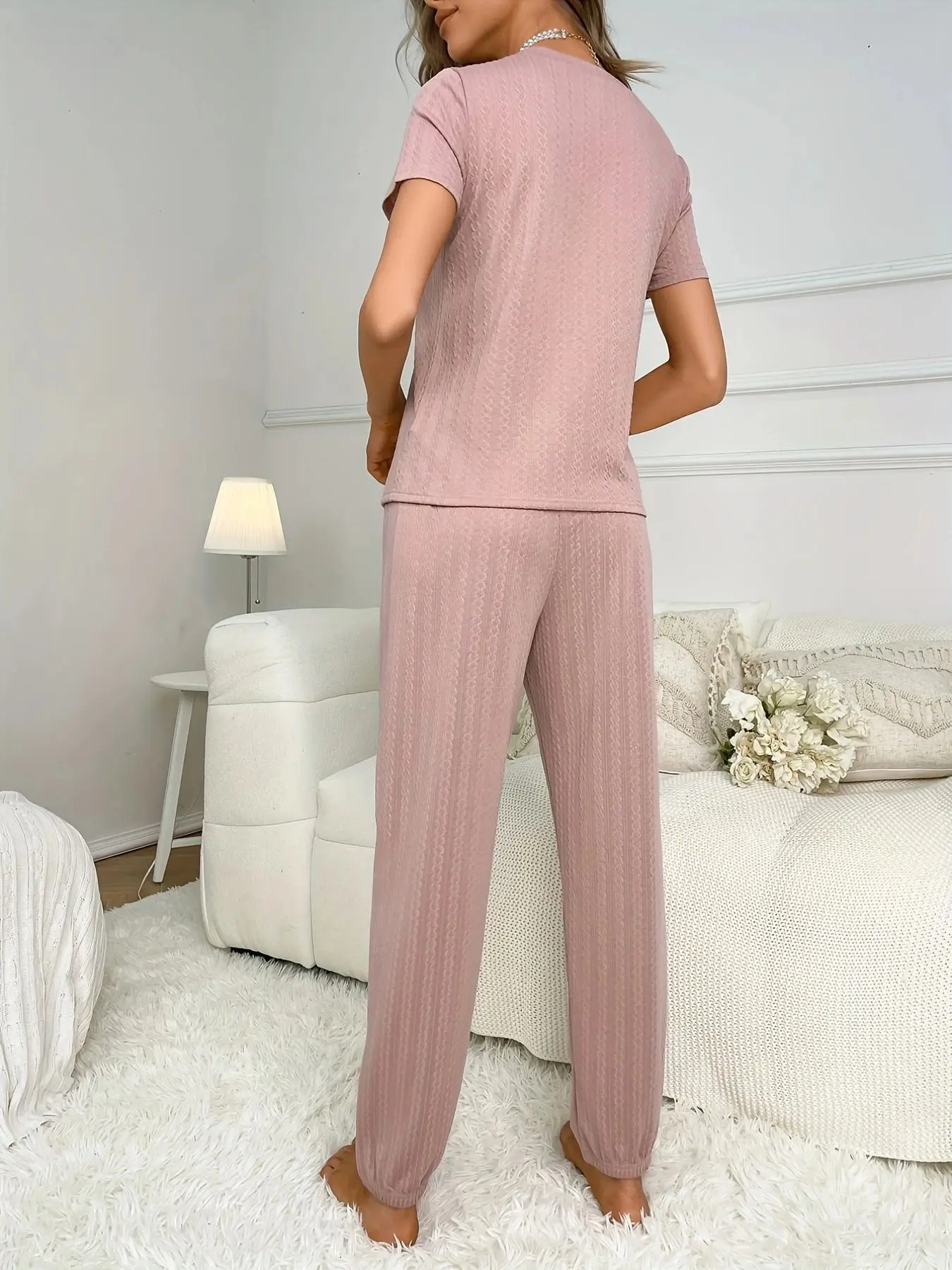 Women's Comfortable Pink Knitted Striped Pajama Set Casual Sports & Home Wear Elastic Waist Closure Breathable