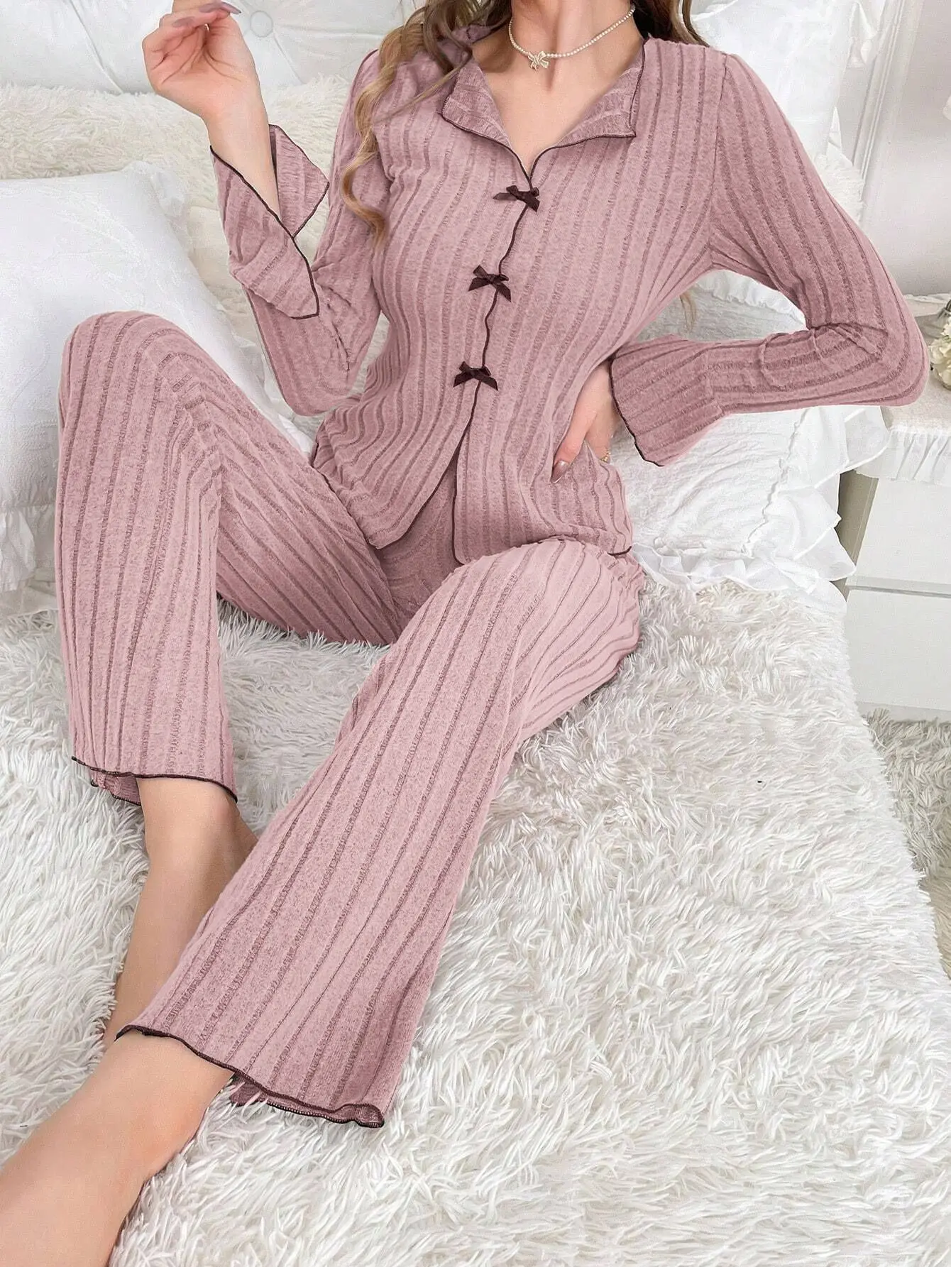 Autumn Winter Women's Breathable Elastic Waist Polyester Turn-Down Collar Long Sleeve Long Pants Pajamas Set