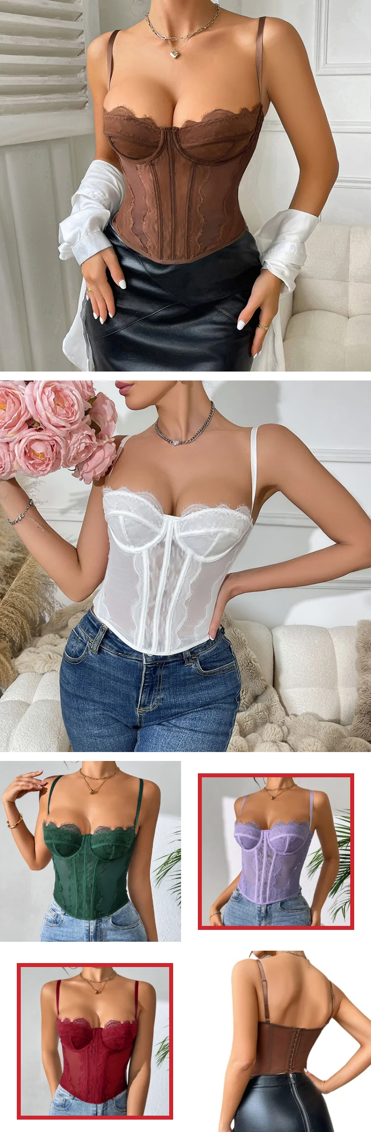Bestselling Hot Girl Sexy Push-Up Fitted Boned Bustier - Eyelash Lace Trim Sheer Coquette Spaghetti Strap Crop Top