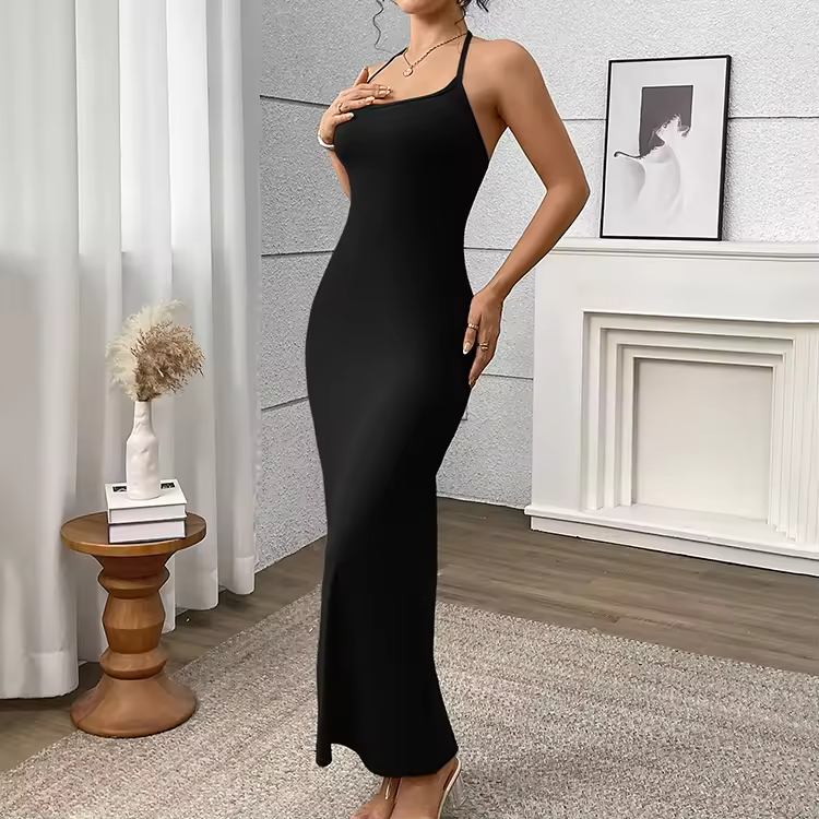 This is a beautiful, form-fitting maxi dress (floor-length or near-floor length) designed to create a sleek, elongated silhouette. It embodies a stylish, elegant bodycon or slip dress aesthetic.