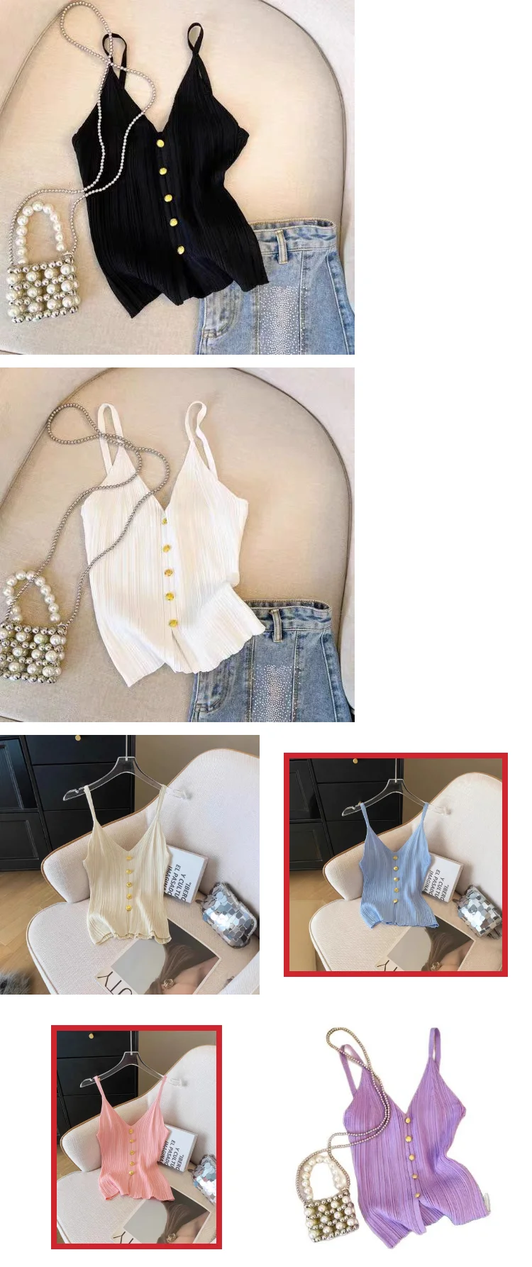 French V-neck Single-breasted Knitted Halter Top Women's Summer Sleeveless Comfortable tank