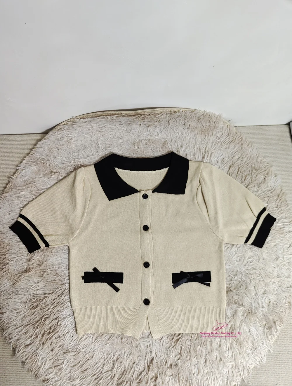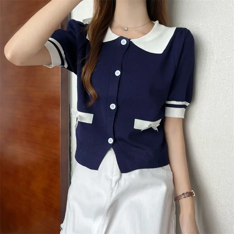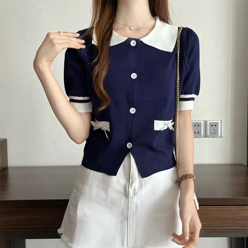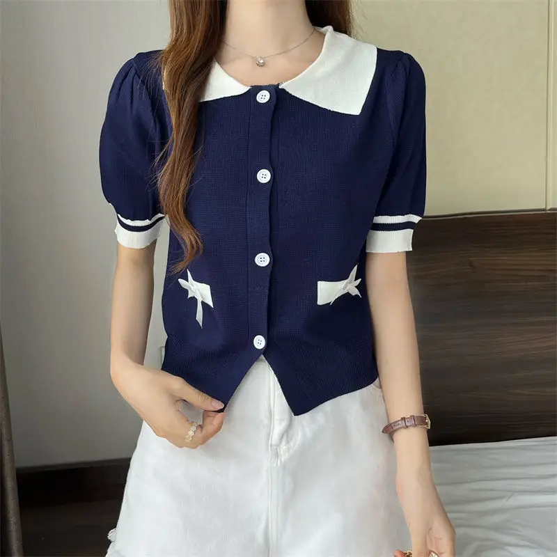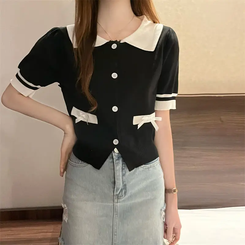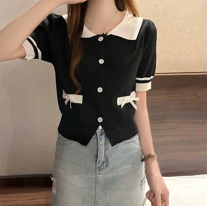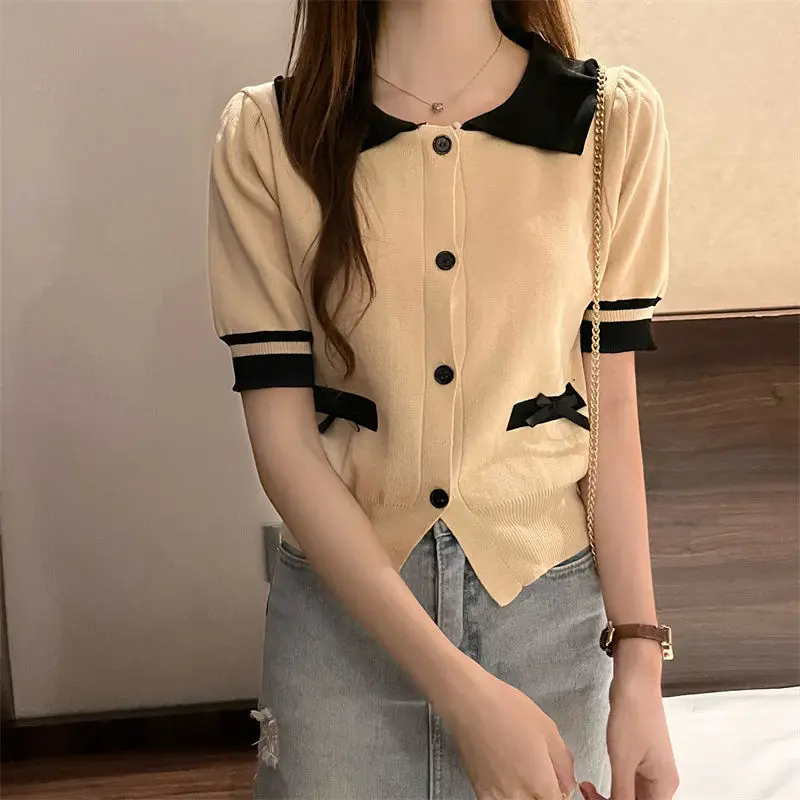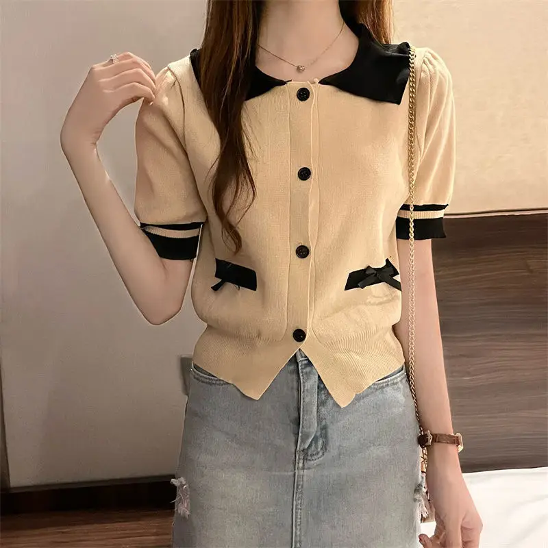 Lapel Tops for Women Color Contrast T-shirt Knit Short-sleeved T-shirt