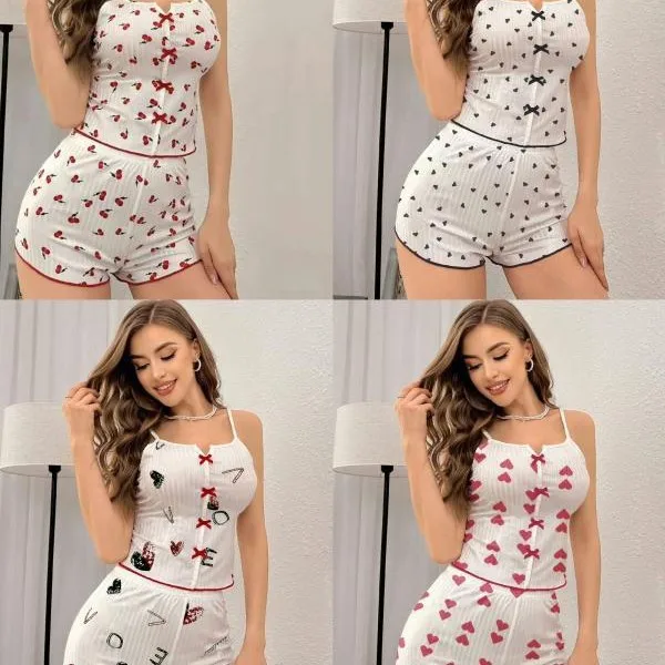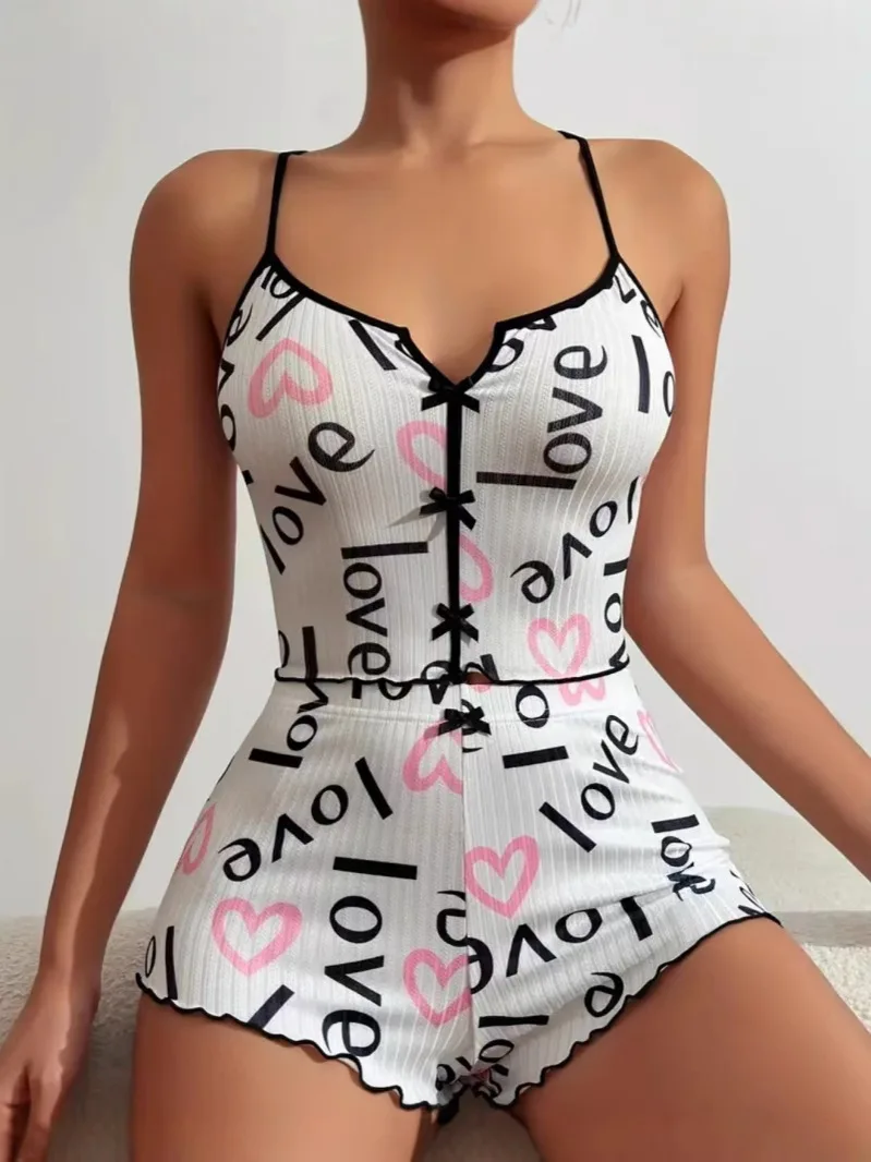 New Arrival Spandex Spring Heart-Shaped Printed Color-Block Clothing Front Slit Strappy Pajamas Set