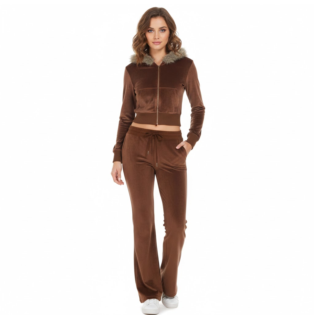 New Winter Color Blocking Casual Two Piece Women's Set Eco - Friendly Velvet Short Hooded Zip Hoodie Fur Collar Flared Drawstring - Zeprah
