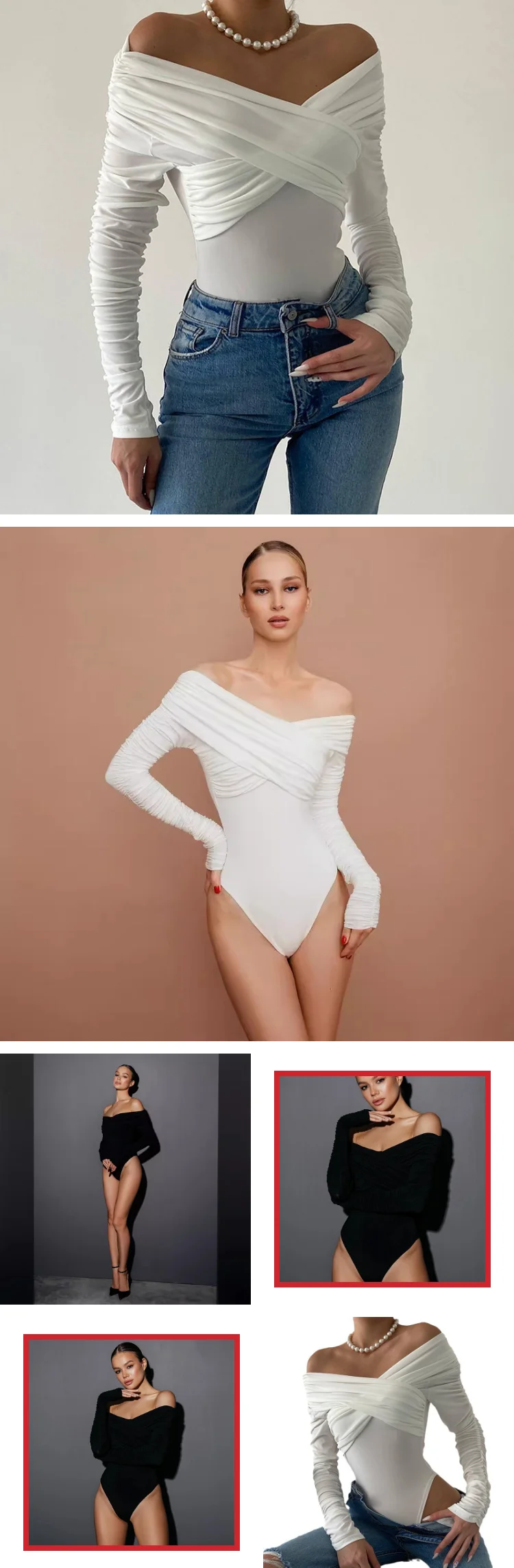 Women's Clothing Off - shoulder V - neck Pleated Long Sleeve Top Tight - fitting Elegant Jumpsuit - Zeprah