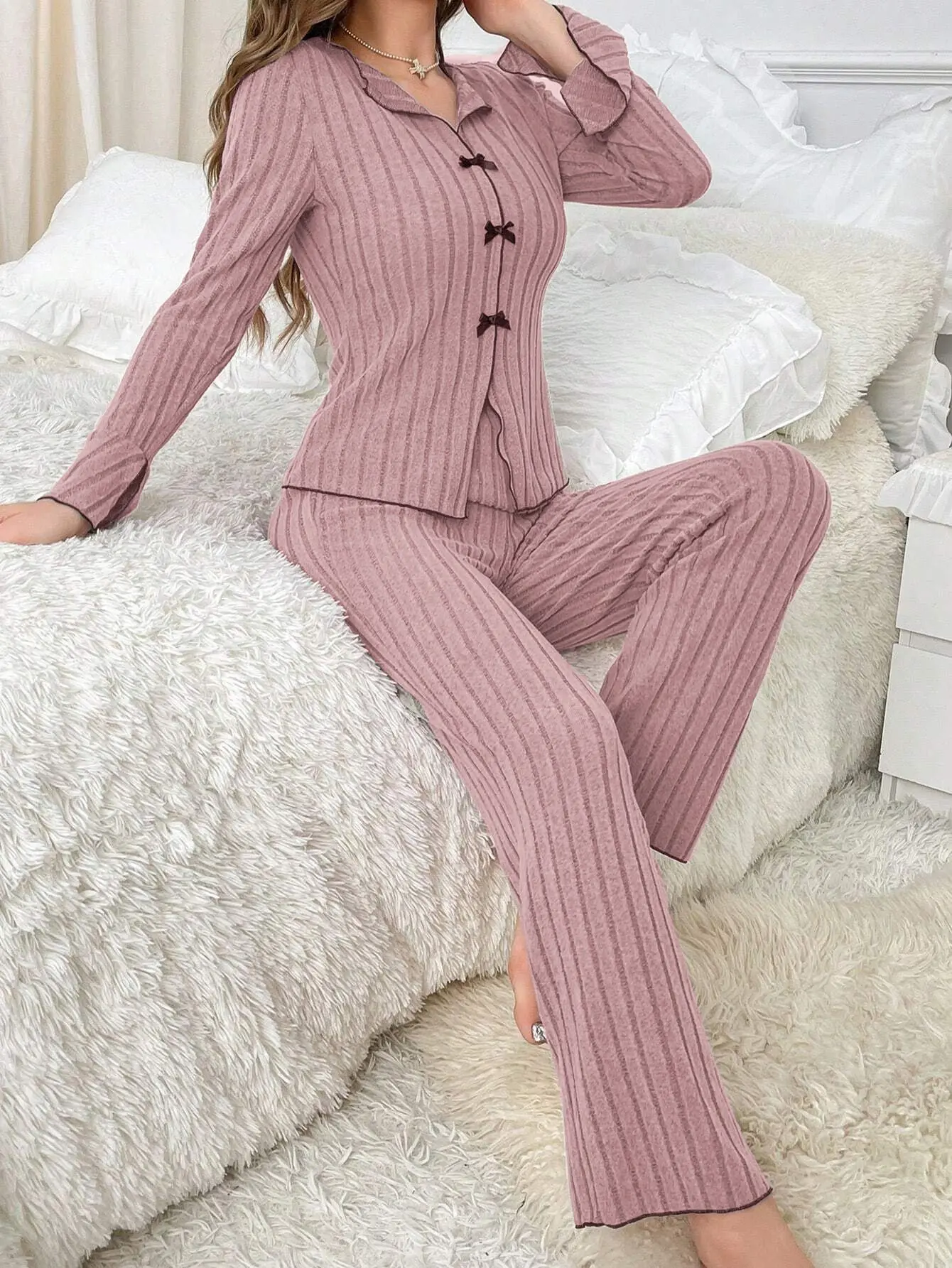 Autumn Winter Women's Breathable Elastic Waist Polyester Turn-Down Collar Long Sleeve Long Pants Pajamas Set
