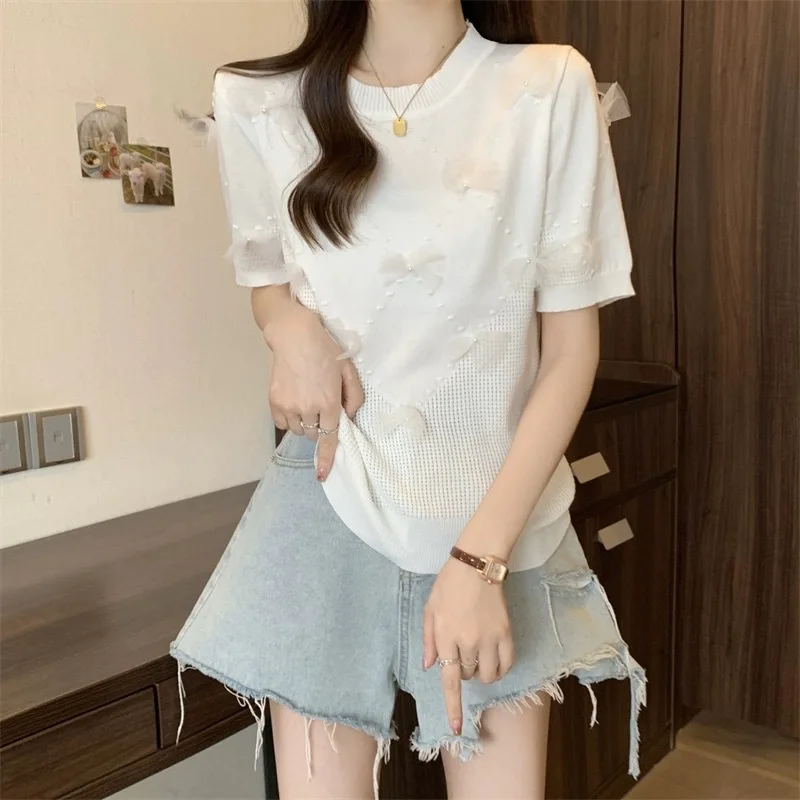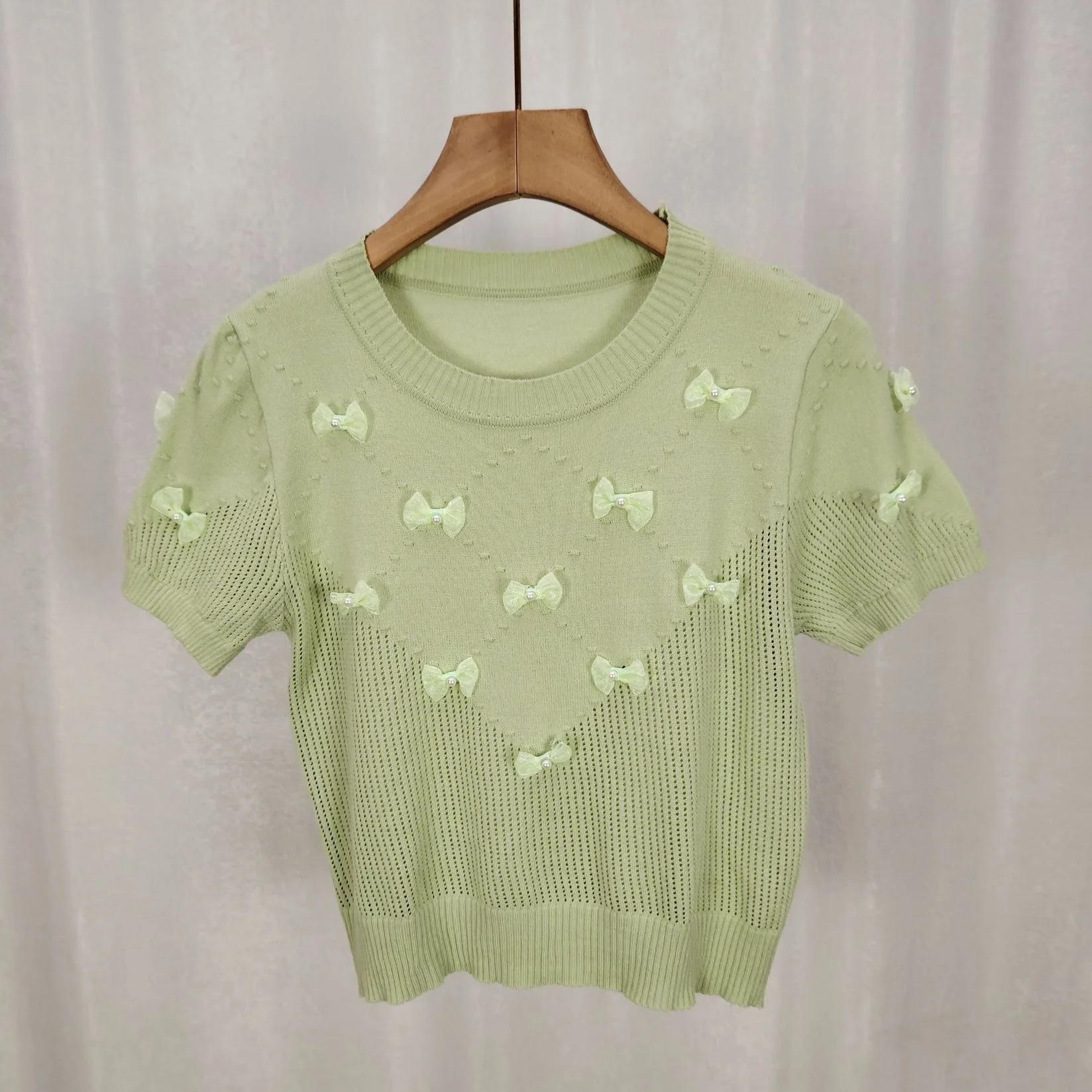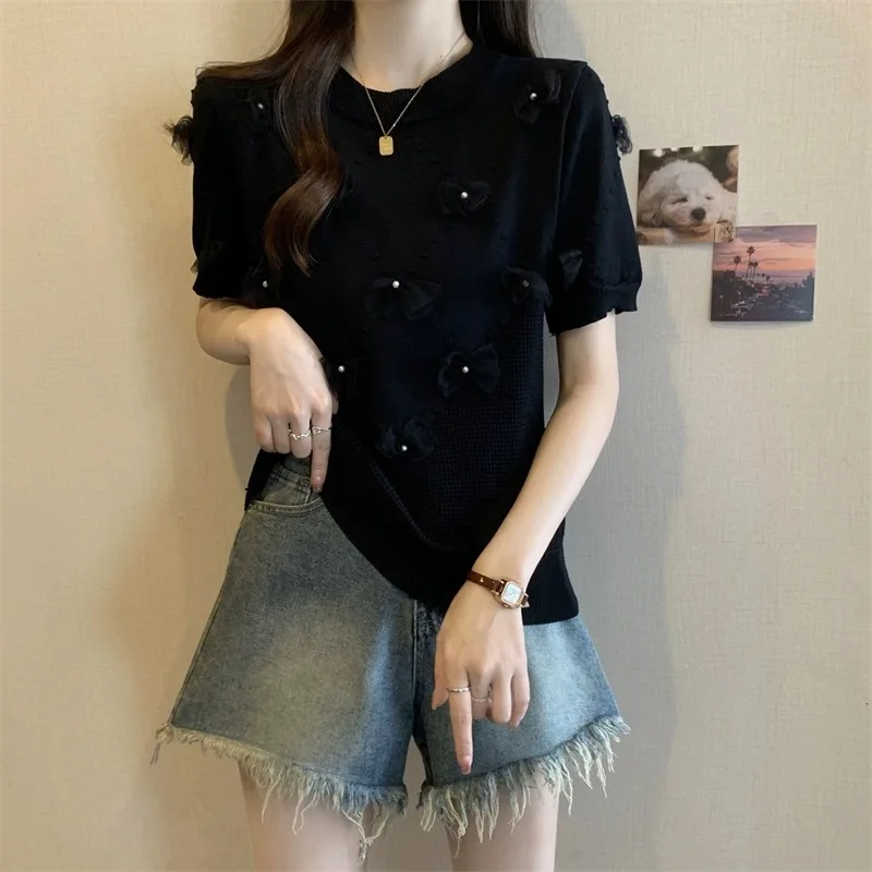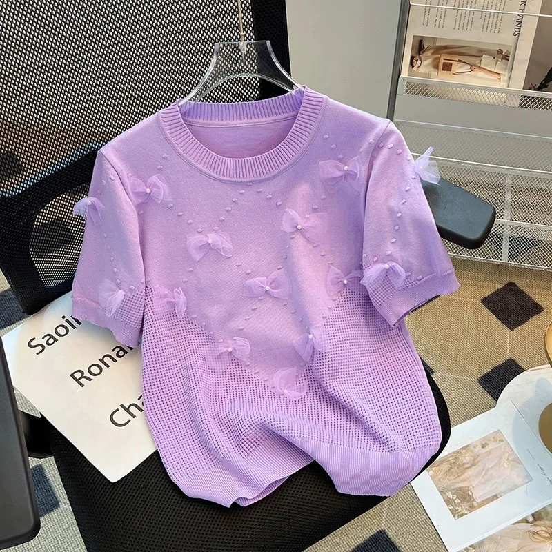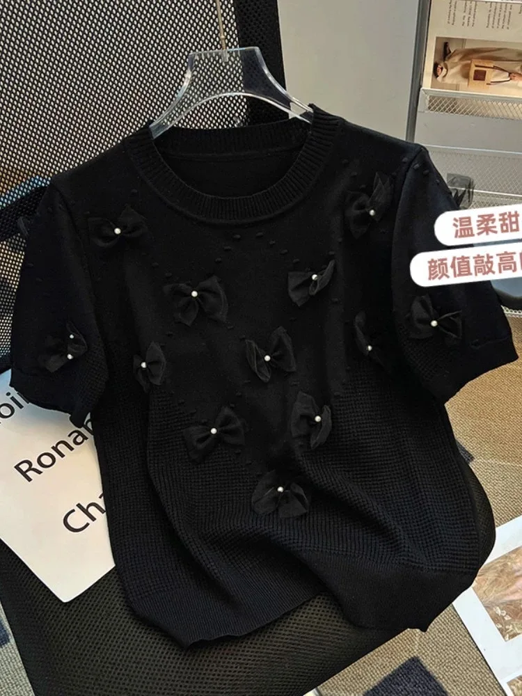 Bow Graphic Tee Bow Round Neck Tops for Women Ice Silk Knitted T-shirt for Women