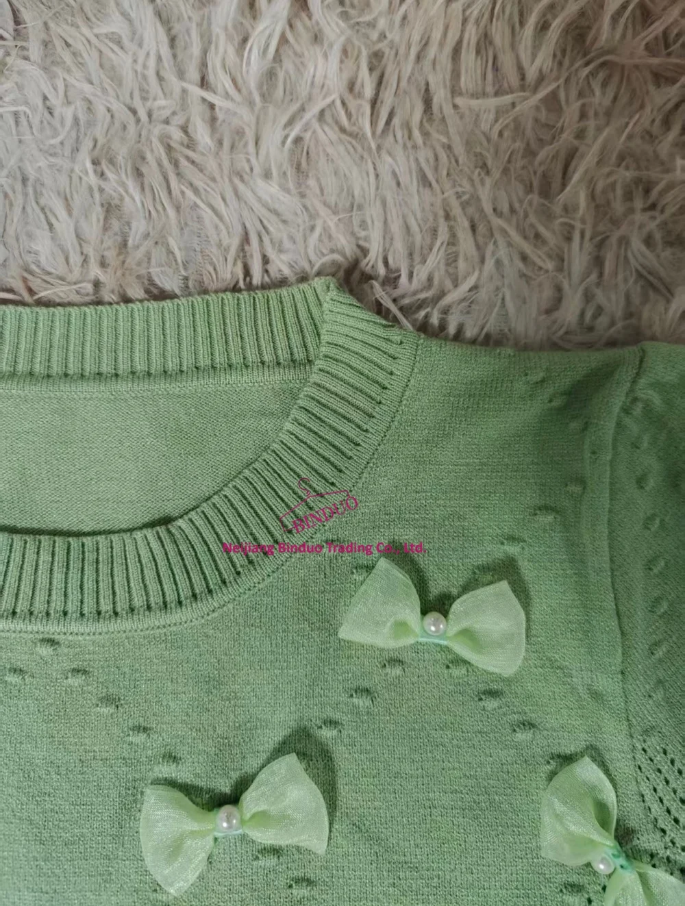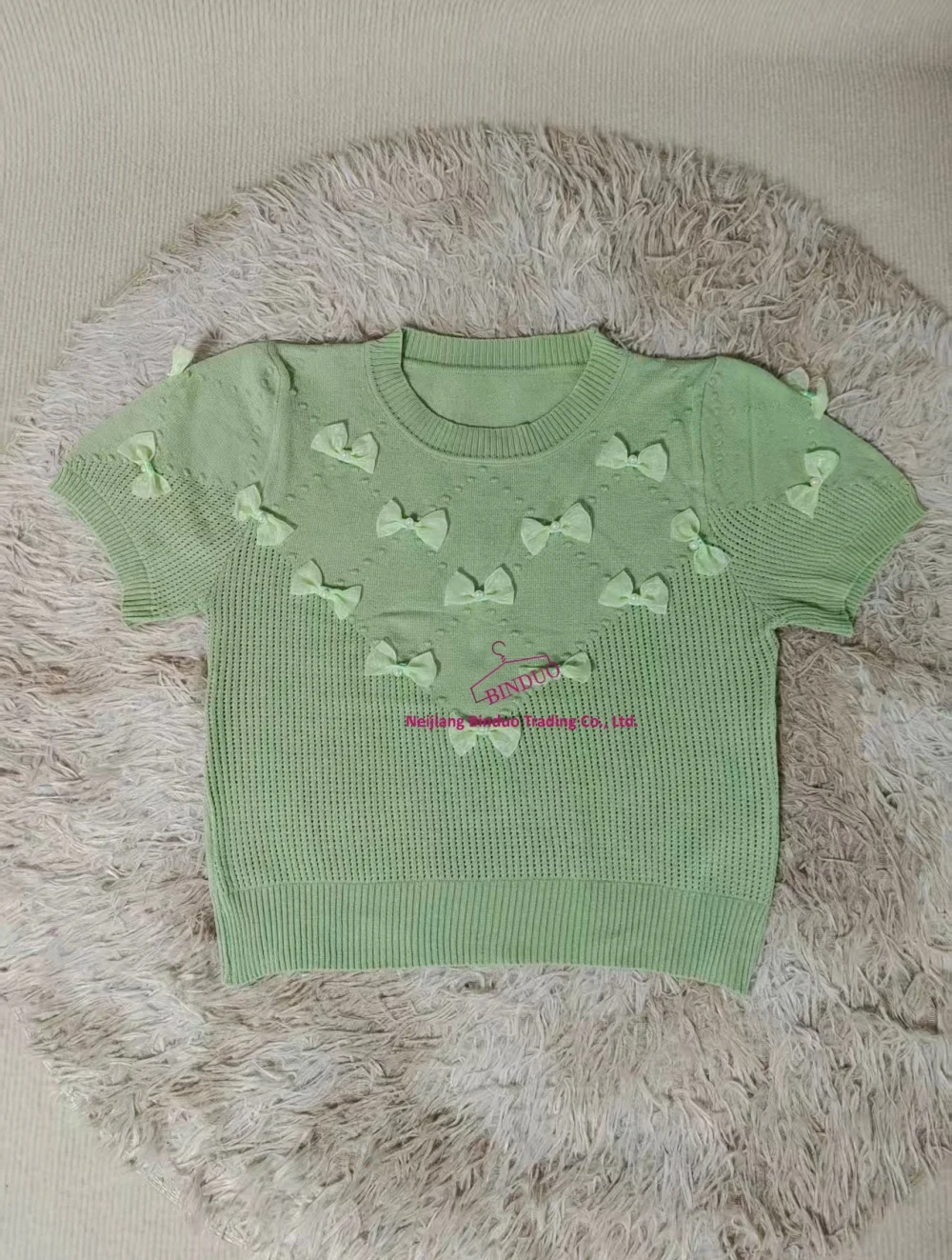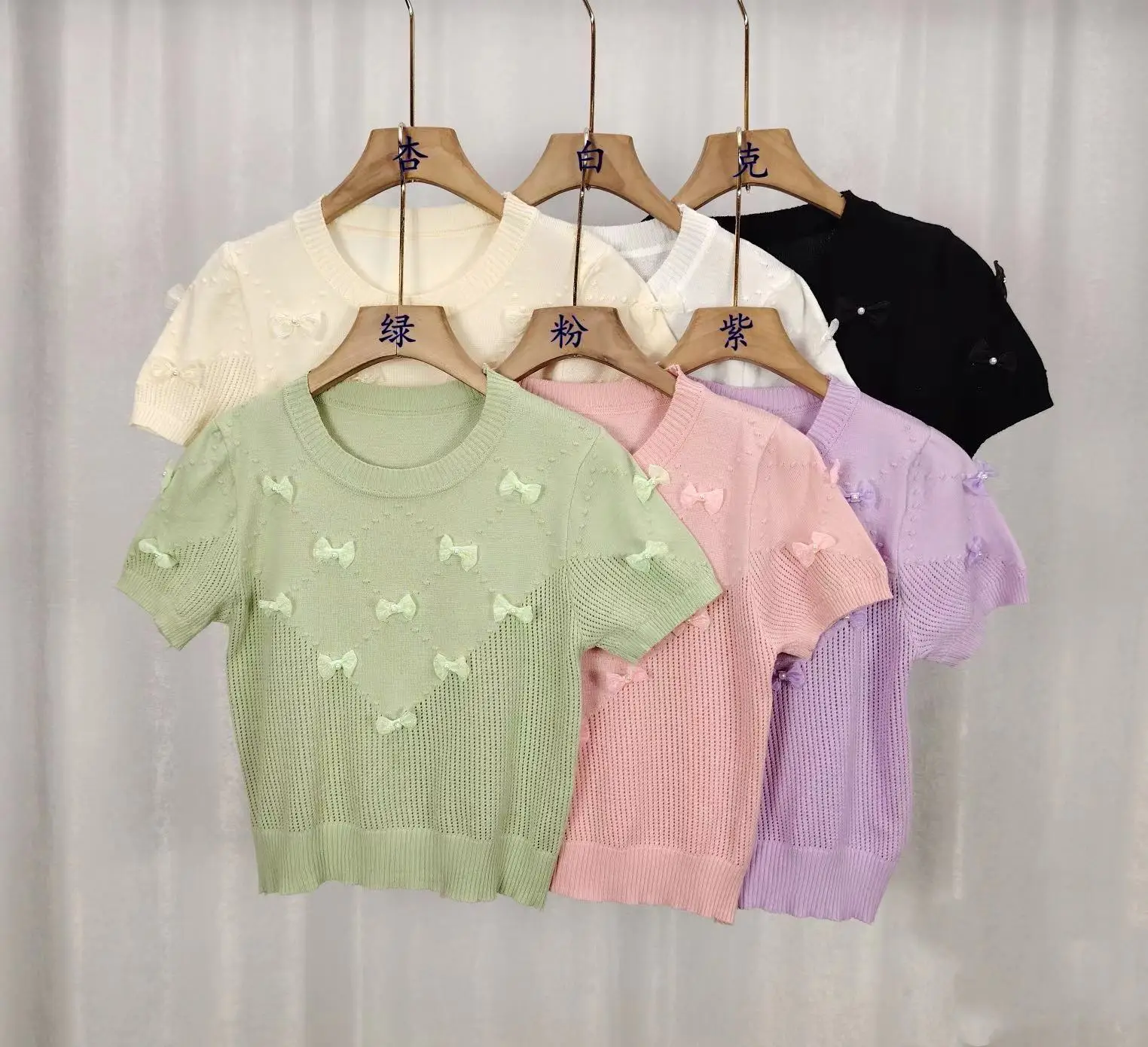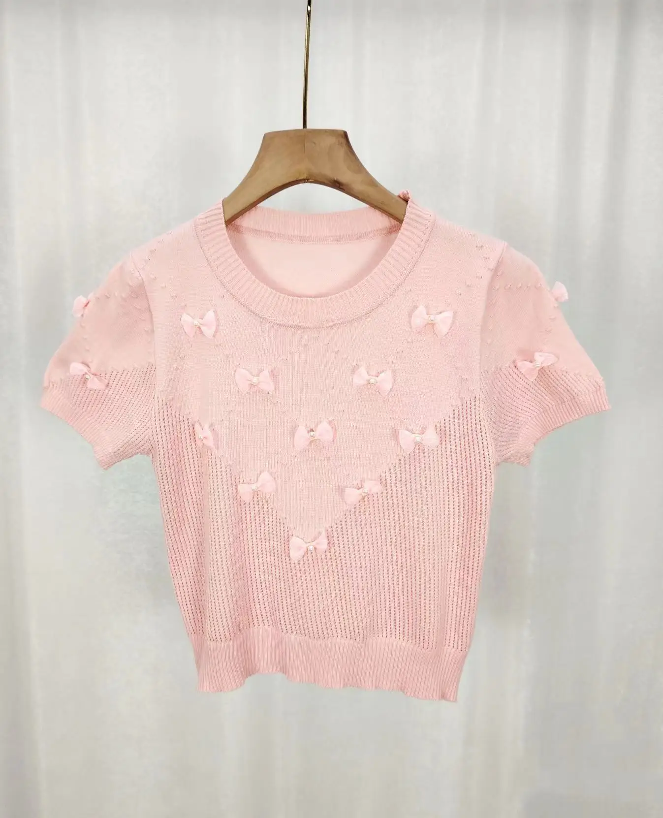 Bow Graphic Tee Bow Round Neck Tops for Women Ice Silk Knitted T-shirt for Women