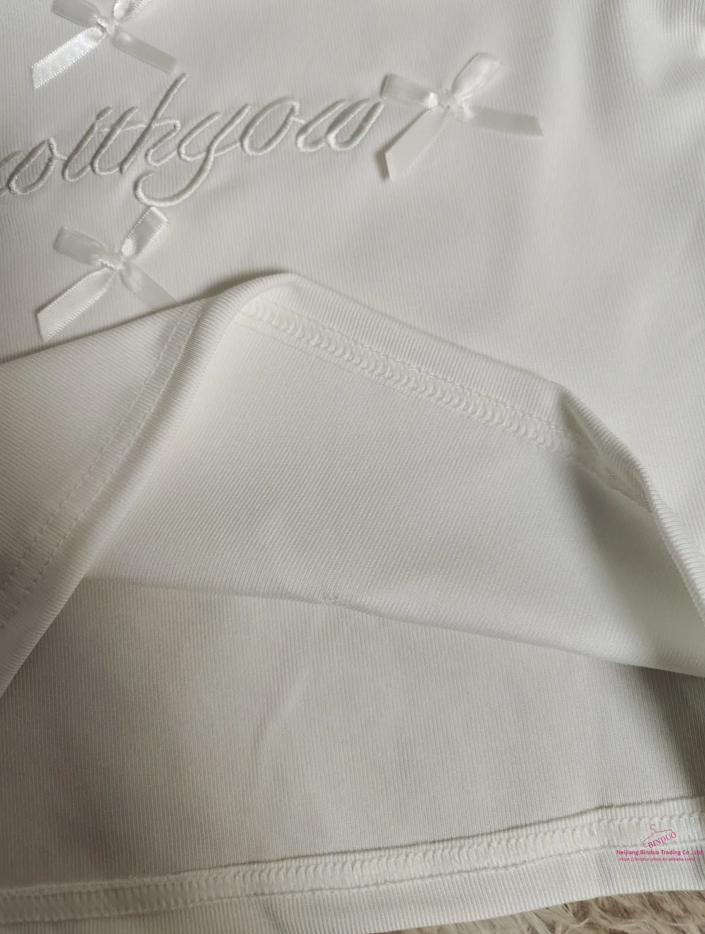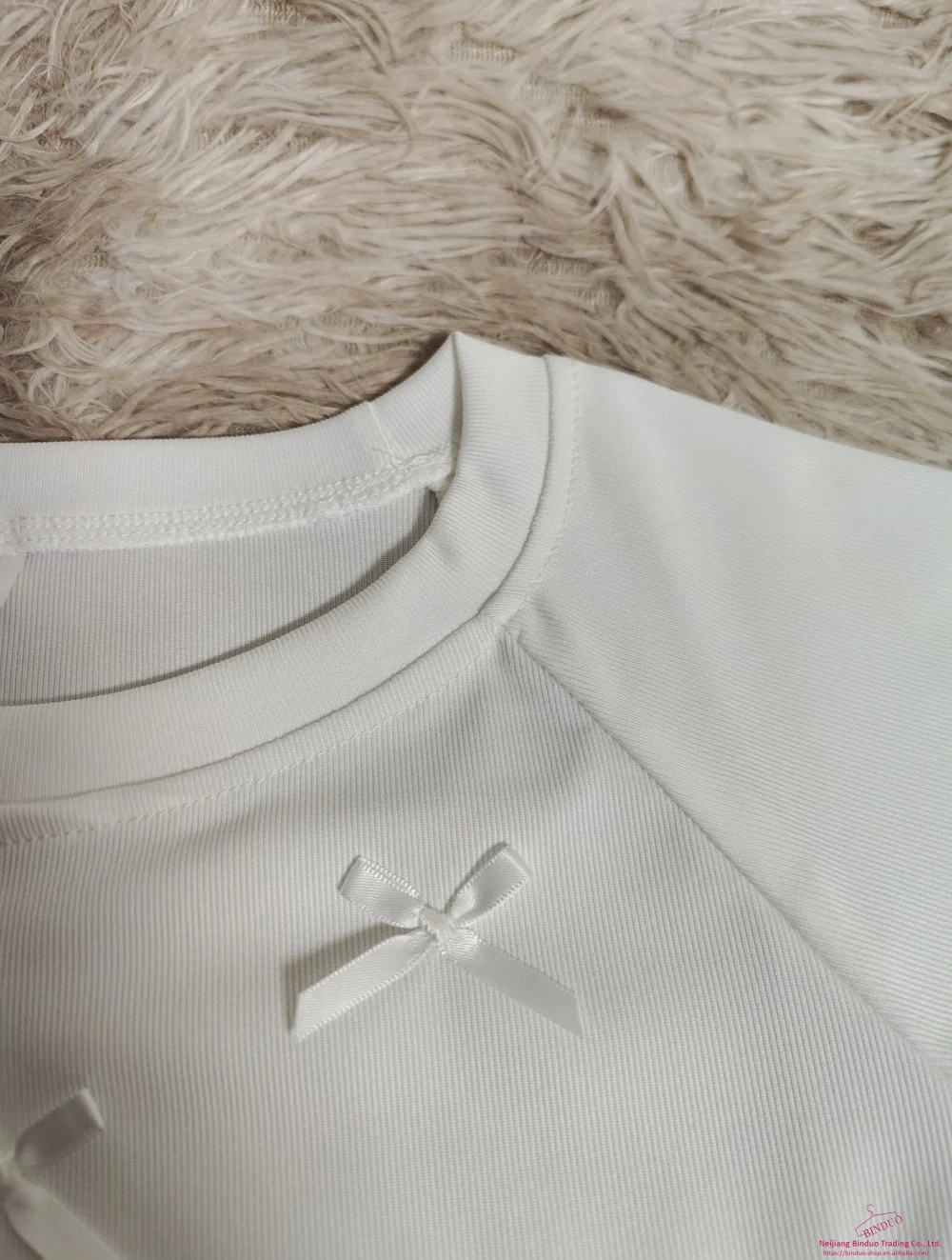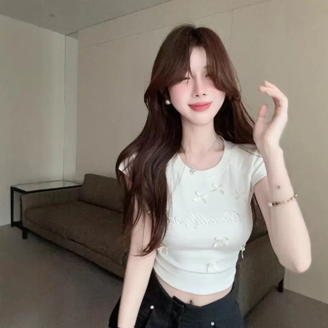 Bow Graphic Tee Embroidered Flower Tops for Women Crewneck Short-sleeved Blouse