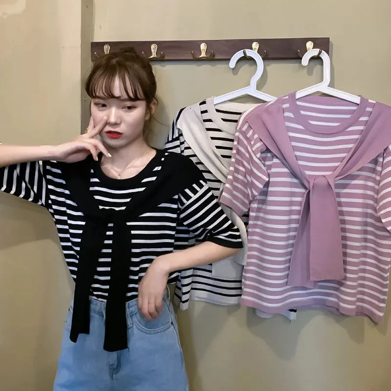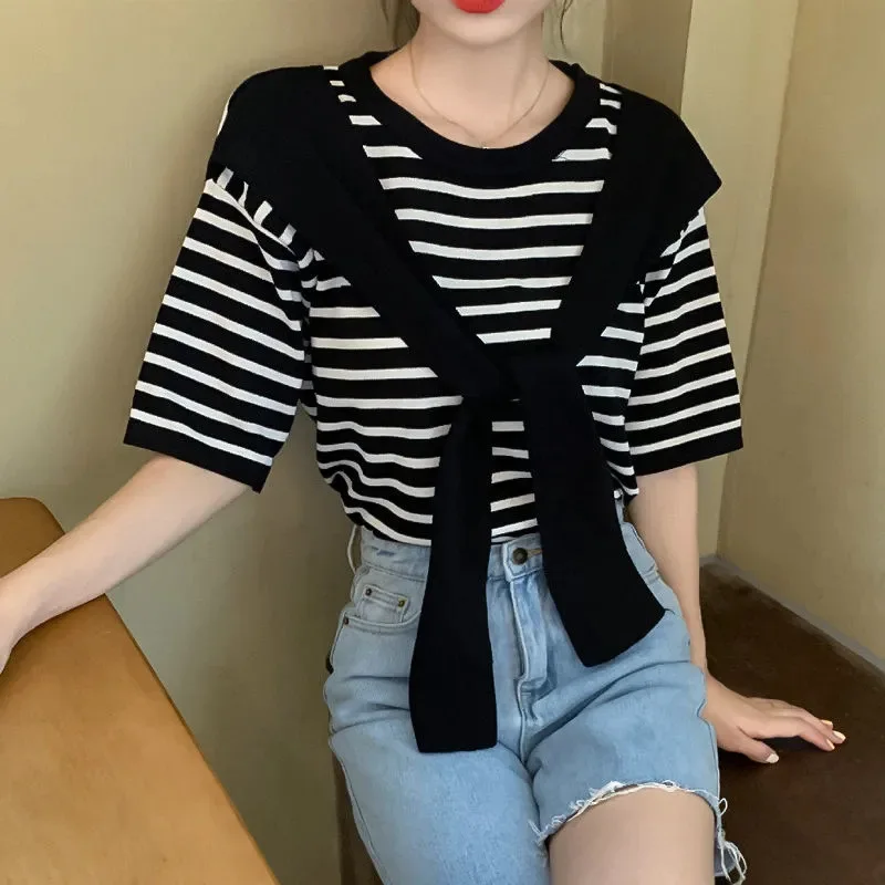 Knitted Women's Clothing Crewneck Tops for Women Popular Short-sleeved Blouse