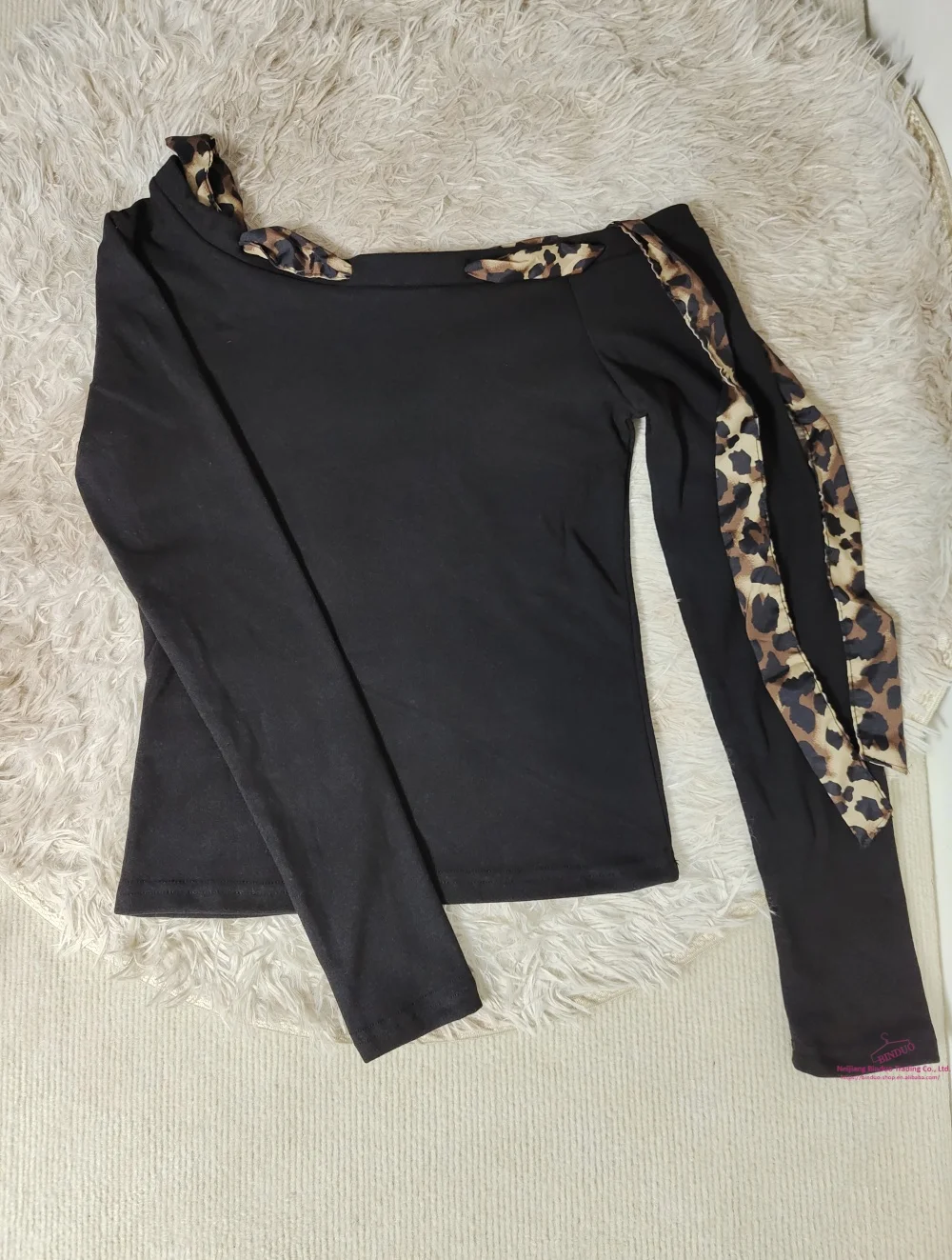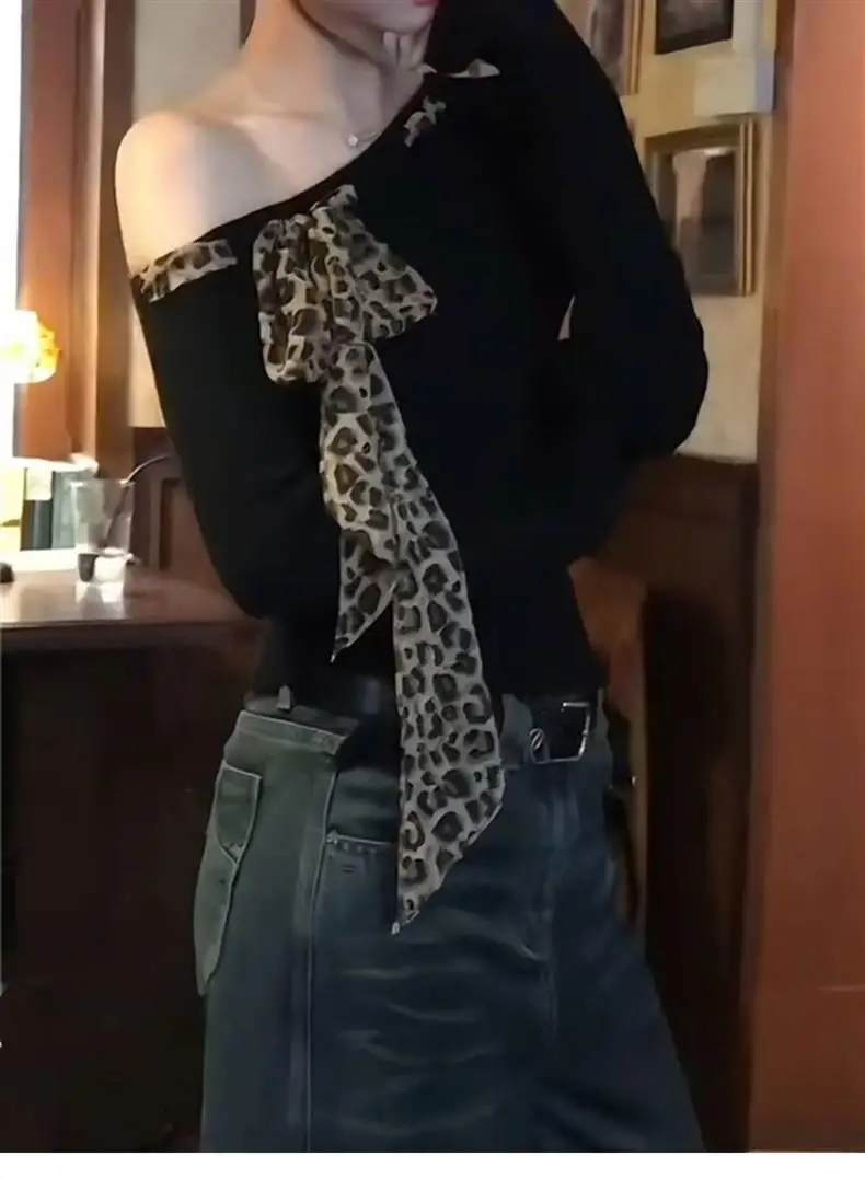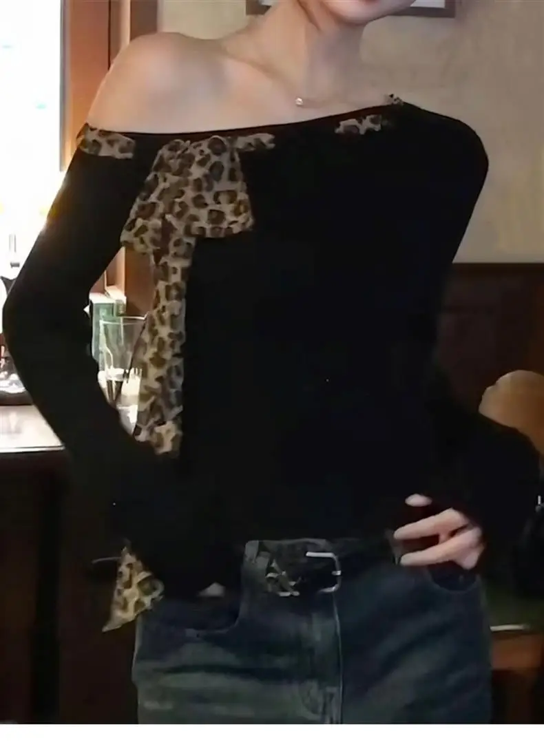 Oblique Shoulder Base Top Vintage Crop Top Leopard Print Bow Long Sleeve T-shirt