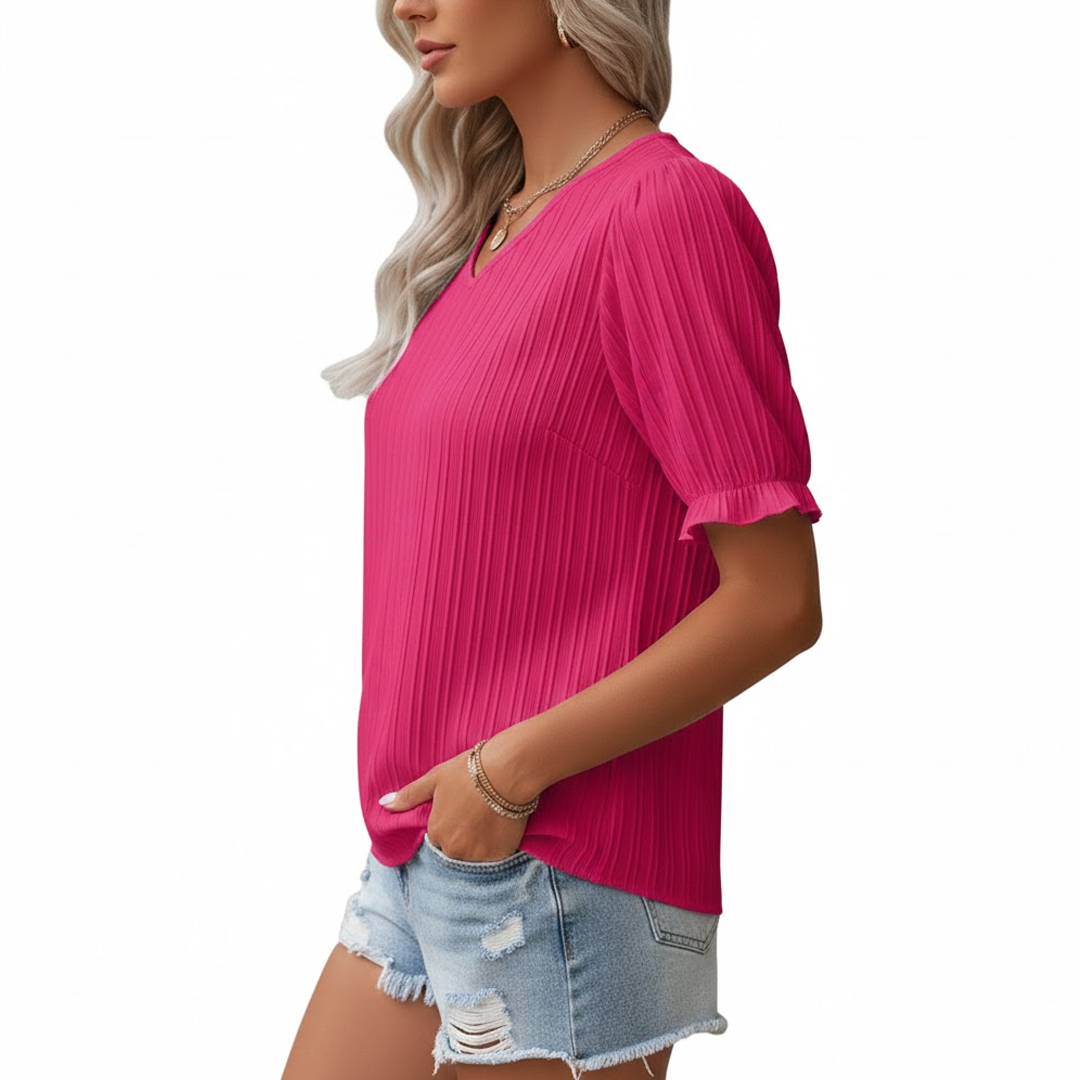 Elevate your wardrobe with this vibrant fuchsia pink blouse for women. Featuring delicate vertical micro-pleats, intricate crochet lace trim on the V-neckline and front placket, and romantic puff sleeves with ruffle edges, this feminine top adds effortless charm and a pop of color to any casual or semi-formal look. Perfect for stylish everyday wear and spring-summer outfits.