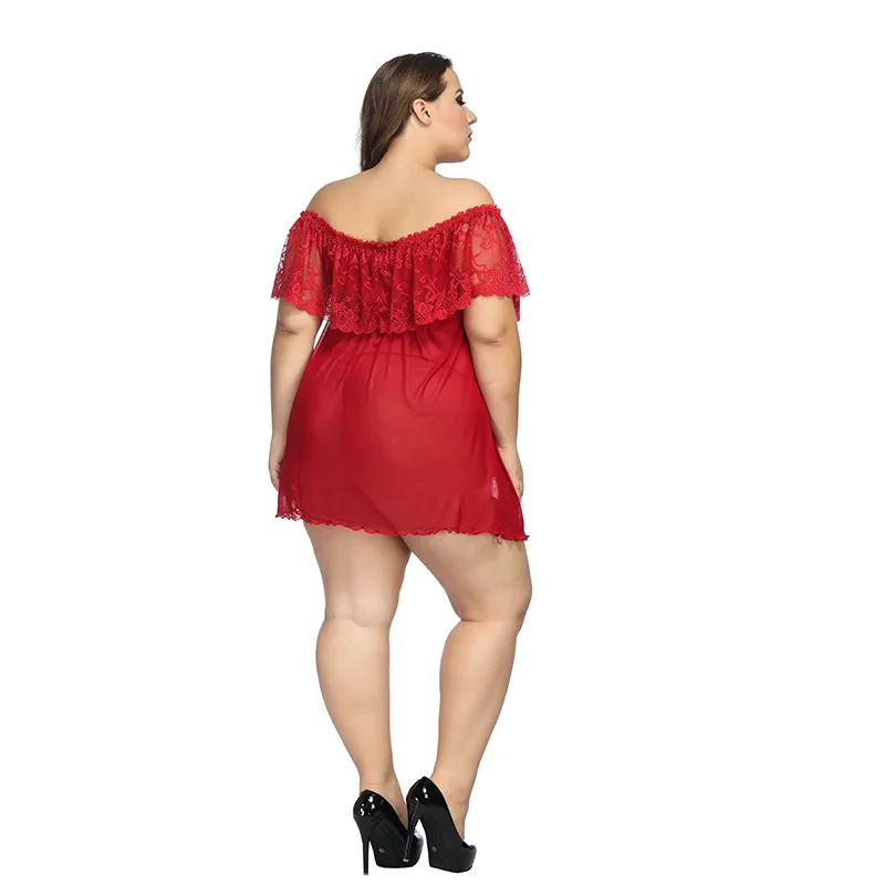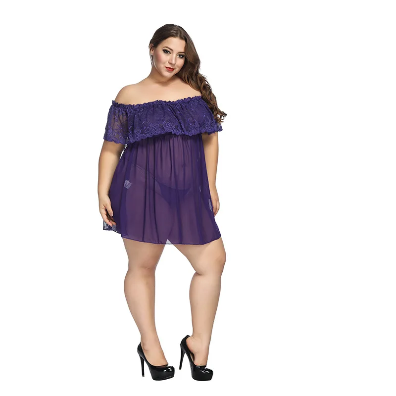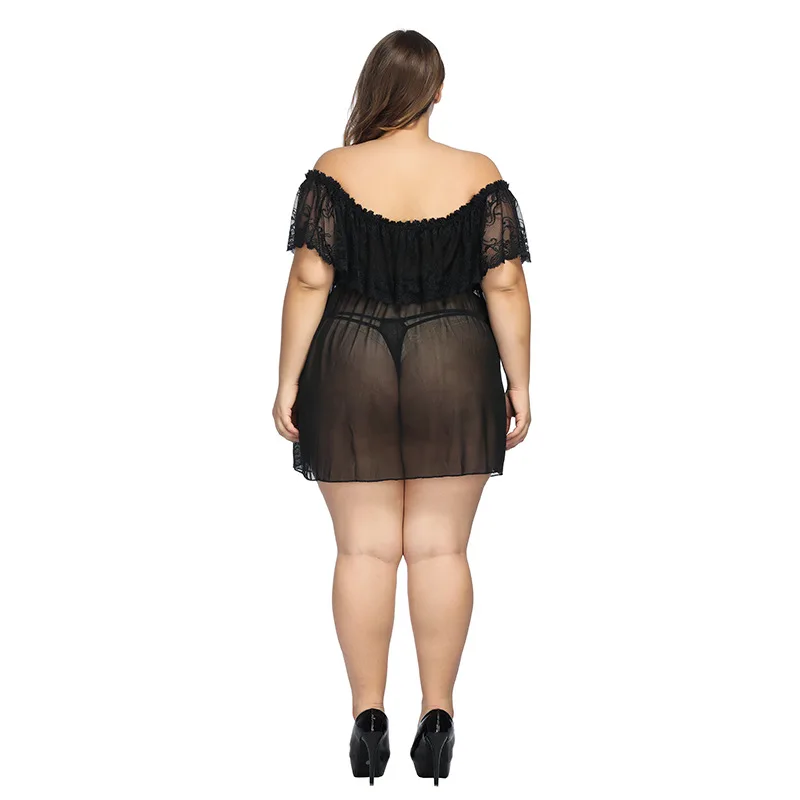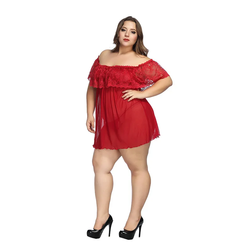 Sexy Lace See-through Plus Size Polyester Nightdress Off-shoulder Nightgown No Sleeves