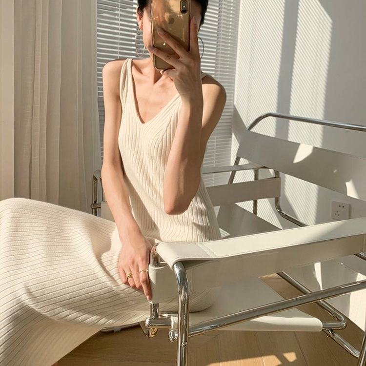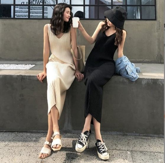 This versatile and comfortable ribbed knit maxi tank dress is a staple for warm weather, available in classic Cream and Black. It features a simple V-neckline and a subtle side slit for easy movement and a modern edge. The figure-skimming knit fabric offers a relaxed yet flattering silhouette perfect for casual daily wear. Easily styled with sandals for summer or layered with a jacket and sneakers for a cool, urban look.