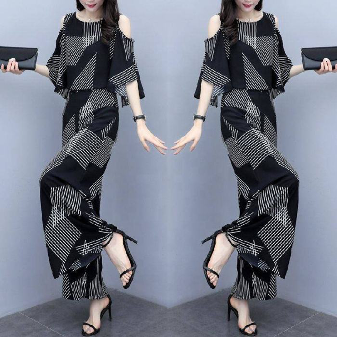 Step into style with this Fashionable 2-piece Women's Casual Set! This elegant, loose-fit summer outfit features a striking black and white geometric print throughout. The top boasts a flattering cold-shoulder design with flowy ruffle sleeves, perfectly complemented by matching wide-leg trousers. An effortless choice for a chic, modern look.