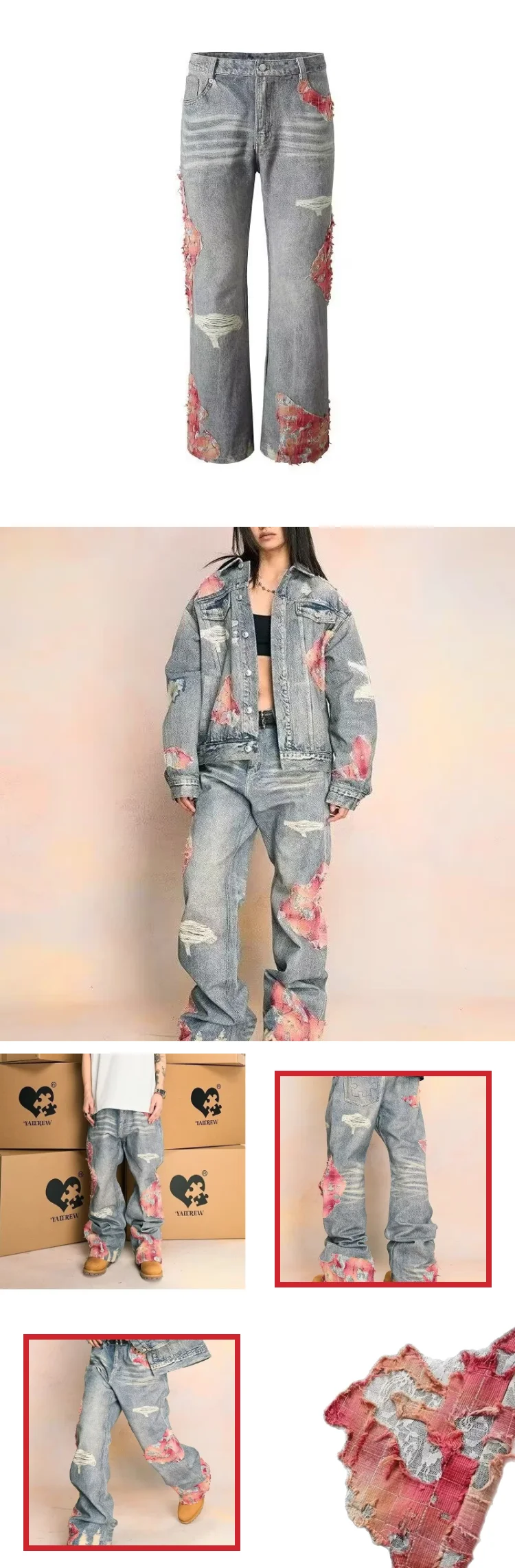 American Streetwear Sunset Lace Patchwork Jeans Men's and Women's Washed Denim Slim Fit Bootcut Casual Pants