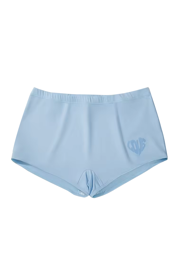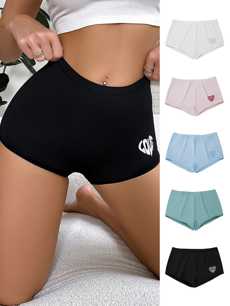 Perfect for lounging, sleeping, or active wear, these soft and stretchy boyshorts/mini shorts are designed for comfort. They feature a low-rise fit, a comfortable wide waistband, and a curved hemline for a flattering fit. Each pair includes a subtle embroidered or printed 'LOVE' heart graphic on the front hip. The set comes in multiple versatile solid colors, including classic black, white, pale pink, light blue, and sage green, making them great as sleepwear, under-shorts, or casual summer bottoms.