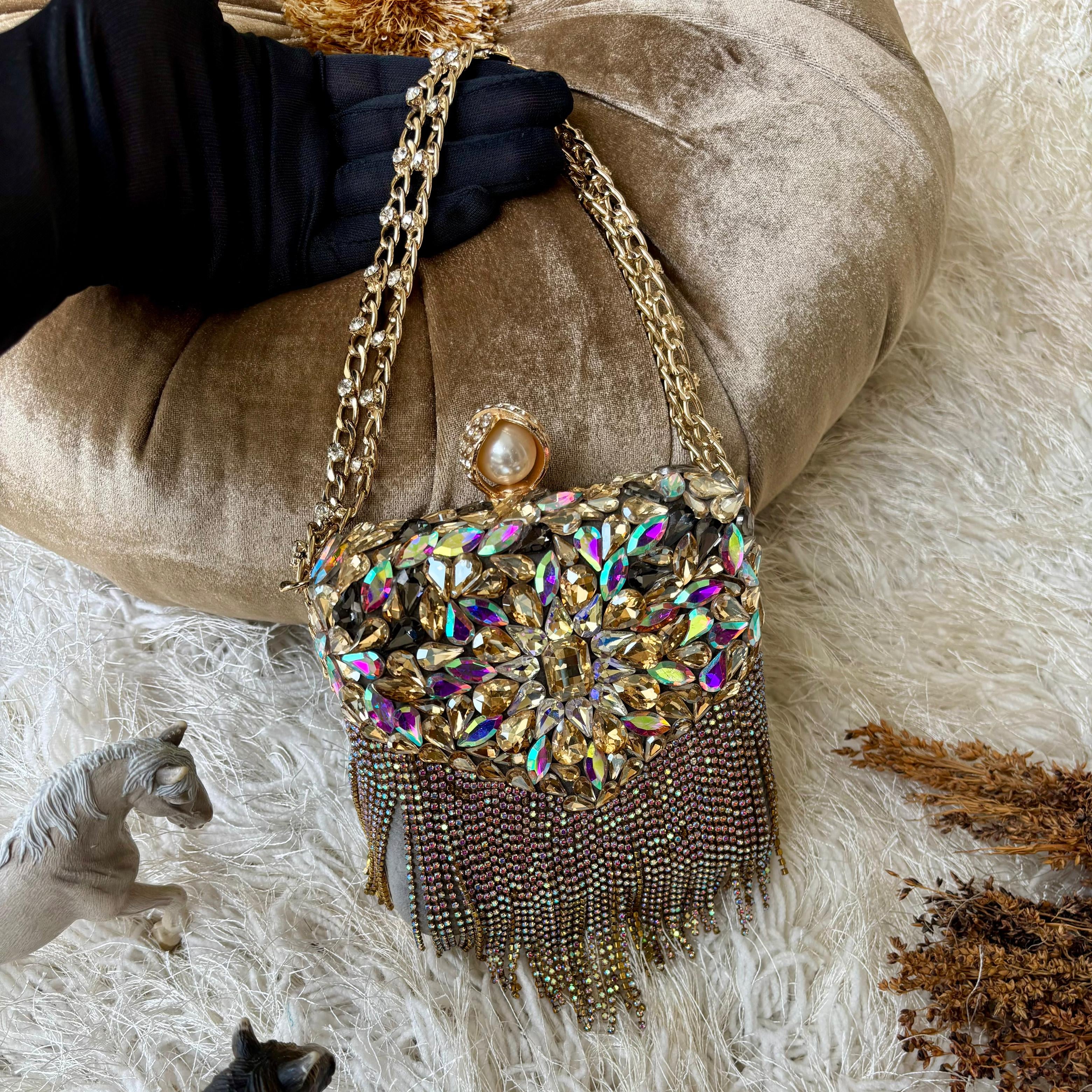 A dazzling statement piece featuring iridescent stones with gold and deep, metallic accents. It's completed with a mesmerizing cascading fringe of multicolored chain beads and a single pearl closure.