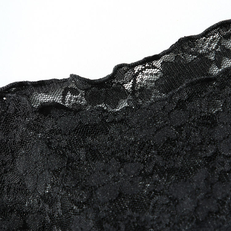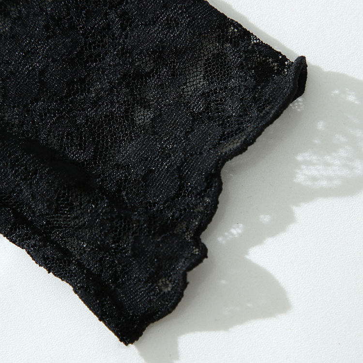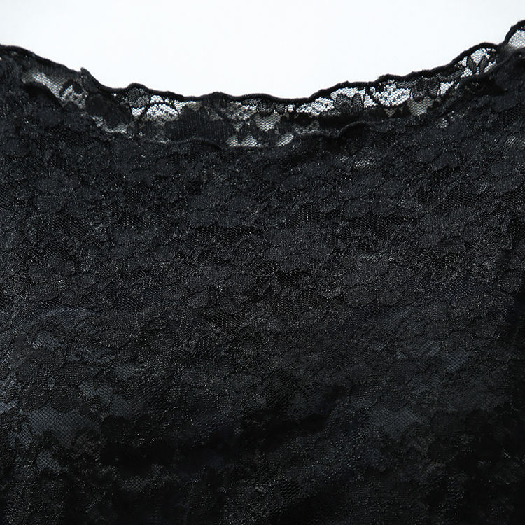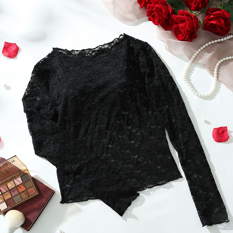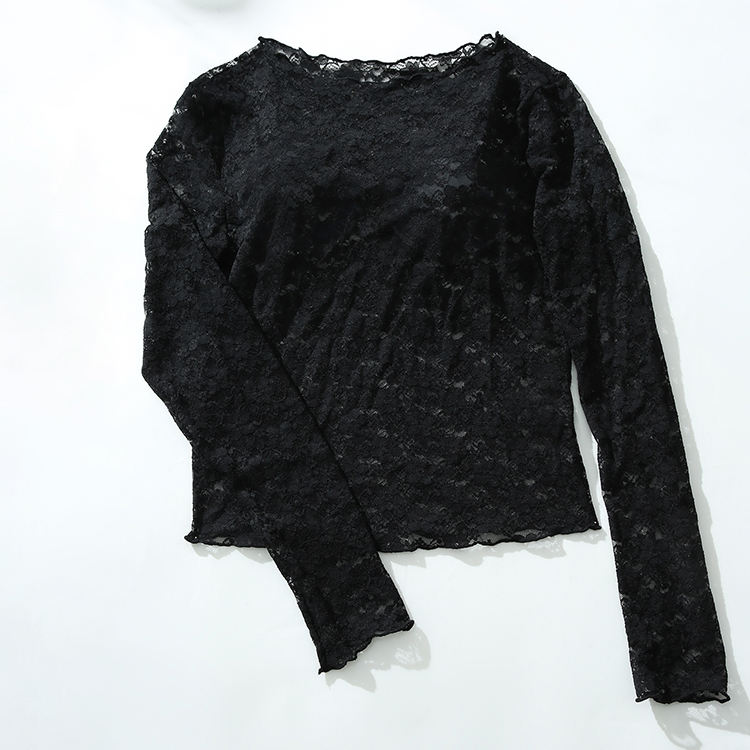 Sheer black floral lace long-sleeve top with scalloped trim. Perfect for elegant layering over bralettes or tanks! Add a touch of dark romance and layering versatility to your wardrobe with this sheer black lace top. It features a classic crew neckline and long sleeves, both finished with a delicate scalloped lace trim.