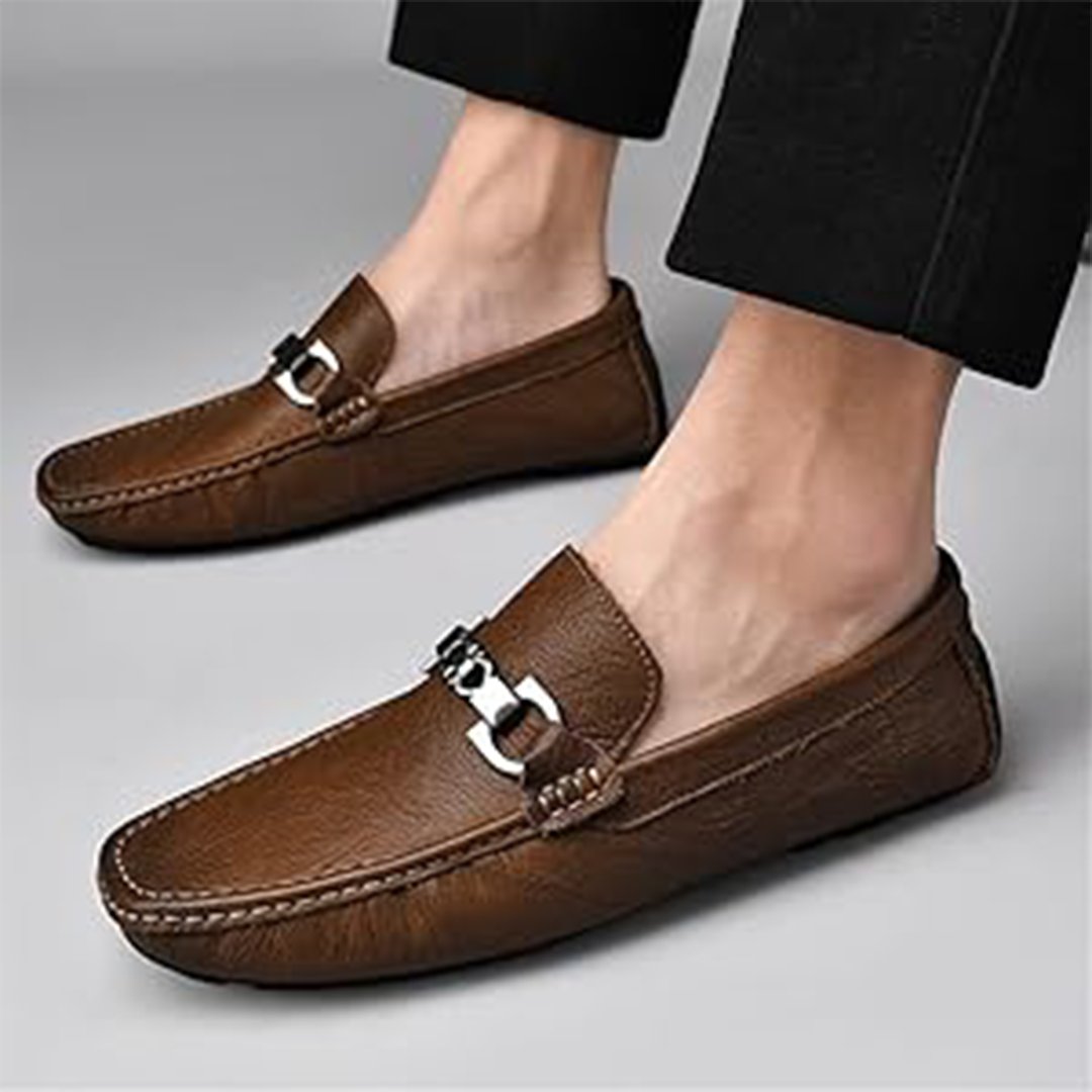 Brown Leather Metal-Bit Loafers
