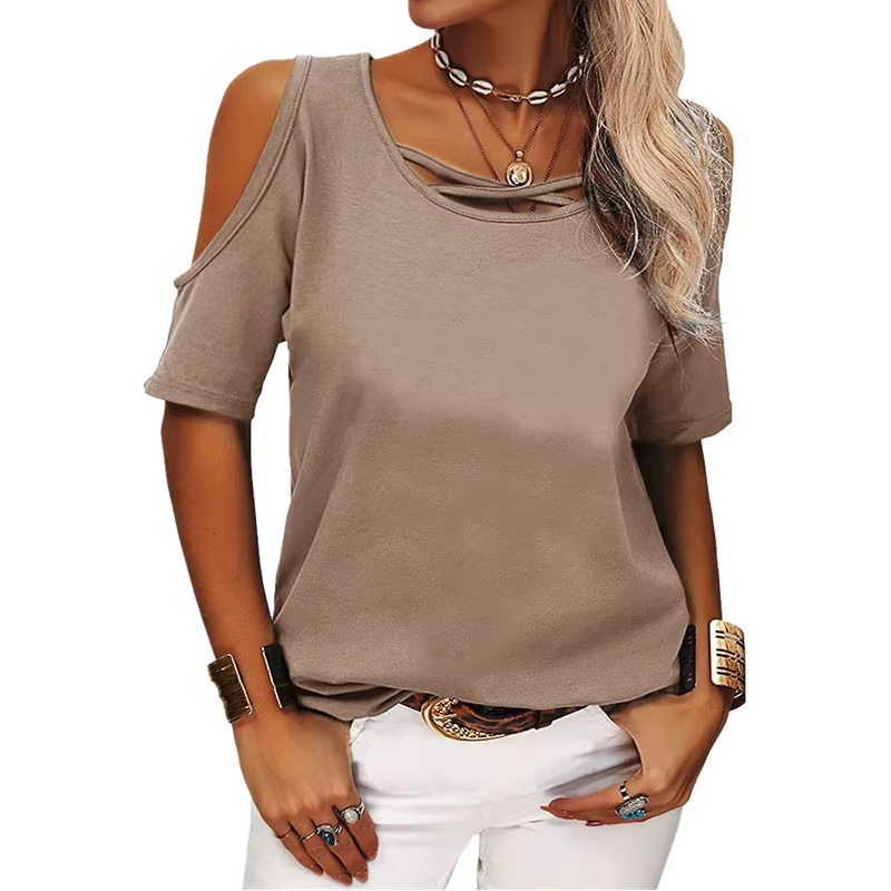 This comfortable and fashionable top features trendy shoulder cutouts (cold shoulders), exposing a bit of skin for a flirtatious look, perfect for warmer weather. It also features a unique criss-cross strap detail (keyhole/cutout) at the neckline, adding visual interest without the need for a necklace. With a relaxed, loose fit and short sleeves, this blouse offers both comfort and style, making it ideal for casual outings, date nights, or weekend wear.