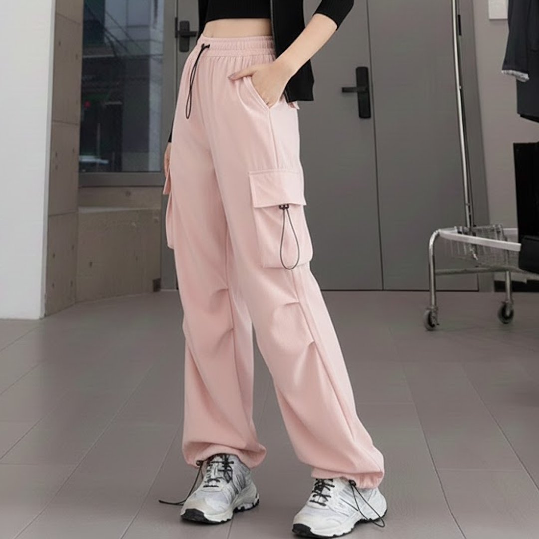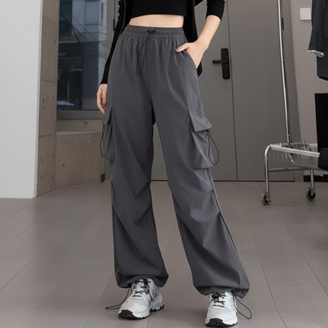 These trendy cargo pants combine streetwear edge with a comfortable, flowy silhouette.... Crafted from a lightweight, parachute-style fabric, they offer a relaxed fit with a fashionable high-waist drawstring for a customizable look. Featuring oversized utility pockets on the sides, they perfectly blend function and contemporary style. Available in versatile colors like charcoal grey, soft pink, and classic black, these are an essential piece for an effortless, casual-chic outfit.