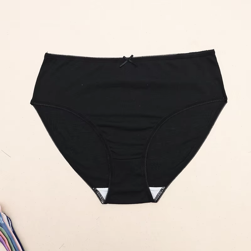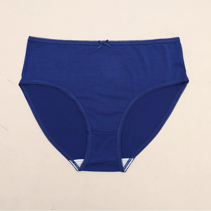 woman wearing a soft, solid lavender/light purple brief or bikini panty. The panty is designed for maximum everyday comfort, utilizing a smooth, breathable cotton or cotton-blend fabric.The edges of the waist and leg openings are neatly finished with a delicate, contrasting picot trim (tiny loops) or scalloped stitching. A small, self-colored mini bow adorns the center front. This piece combines essential comfort with sweet, simple feminine detailing.