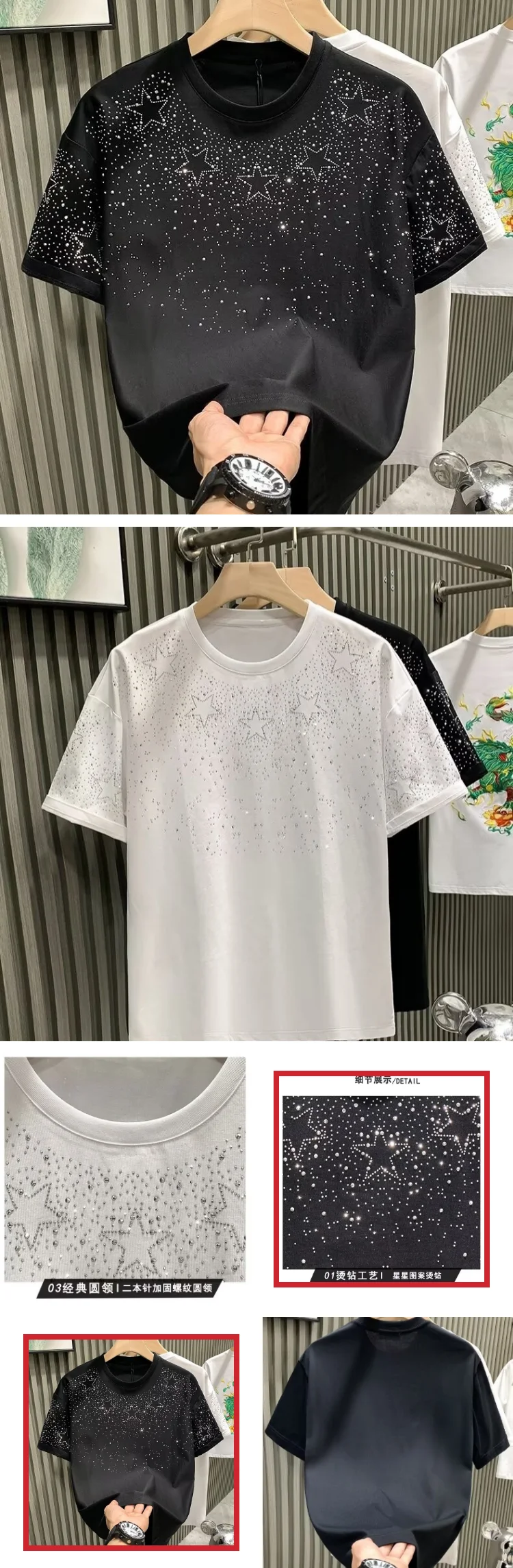 Cotton Rhinestone Collar Short Sleeve T-shirt Fashion Oversized Hip-Hop Heavy-Duty Cotton Men's T-shirt