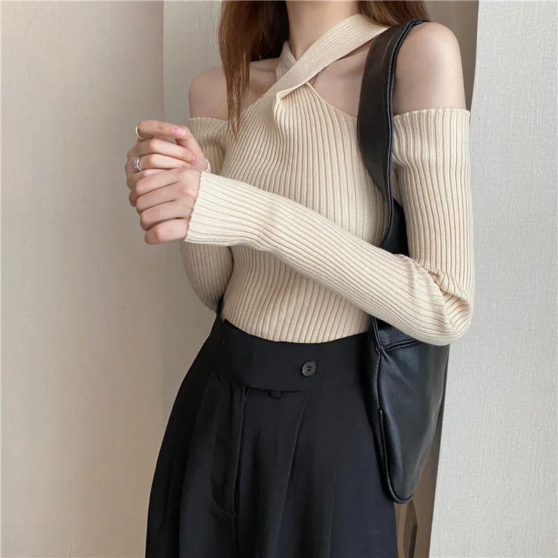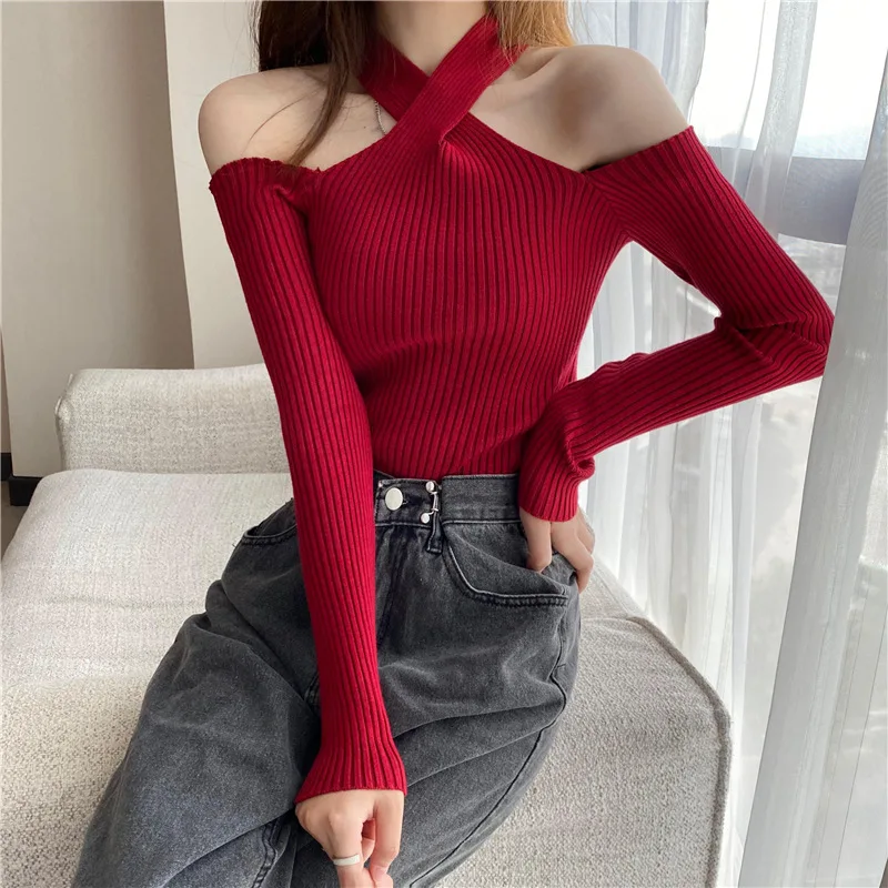 Cross Halter Base Shirt Off - the - shoulder Long - sleeved Knitwear Elegant Ladies' Sweaters - Zeprah