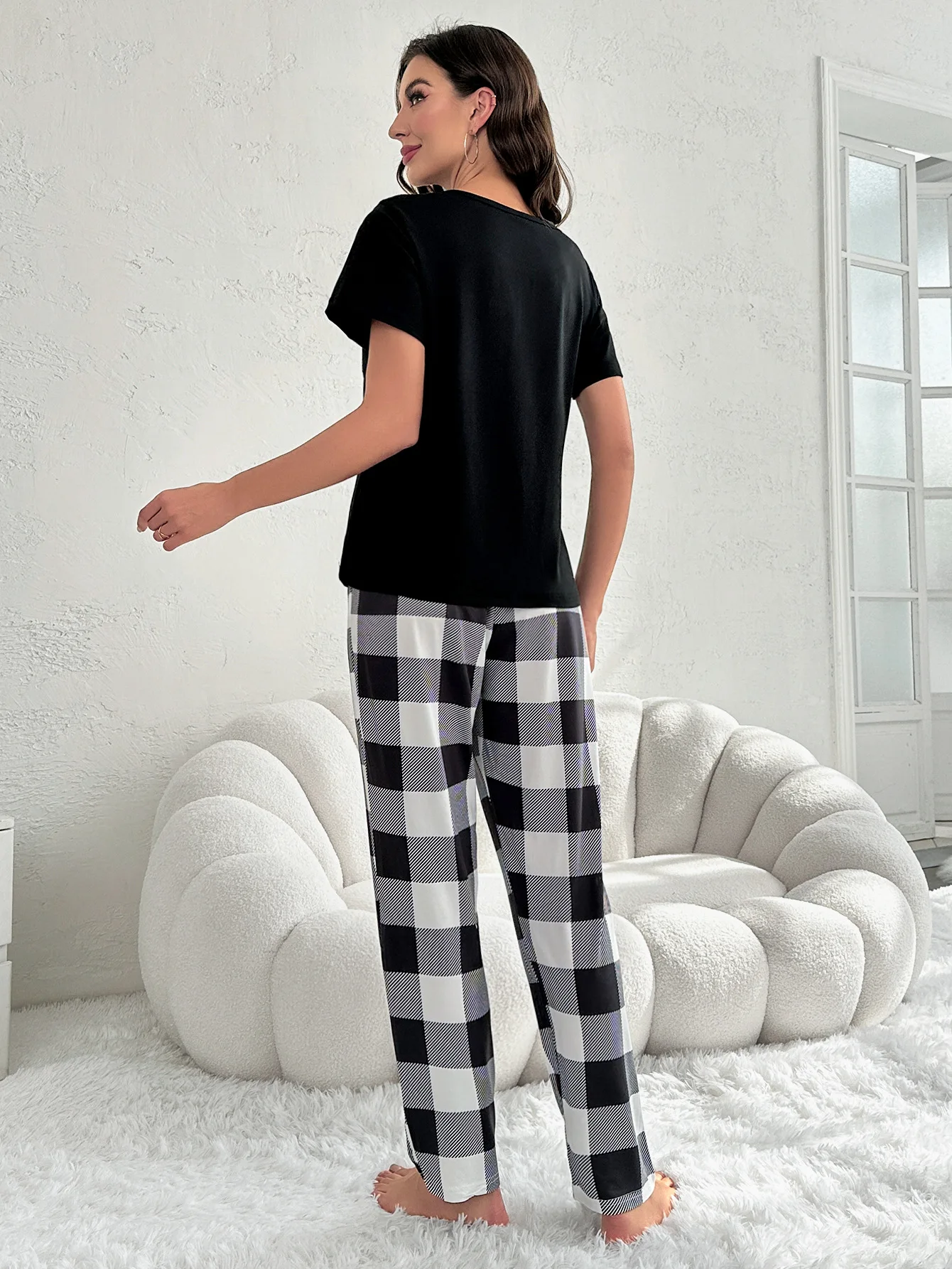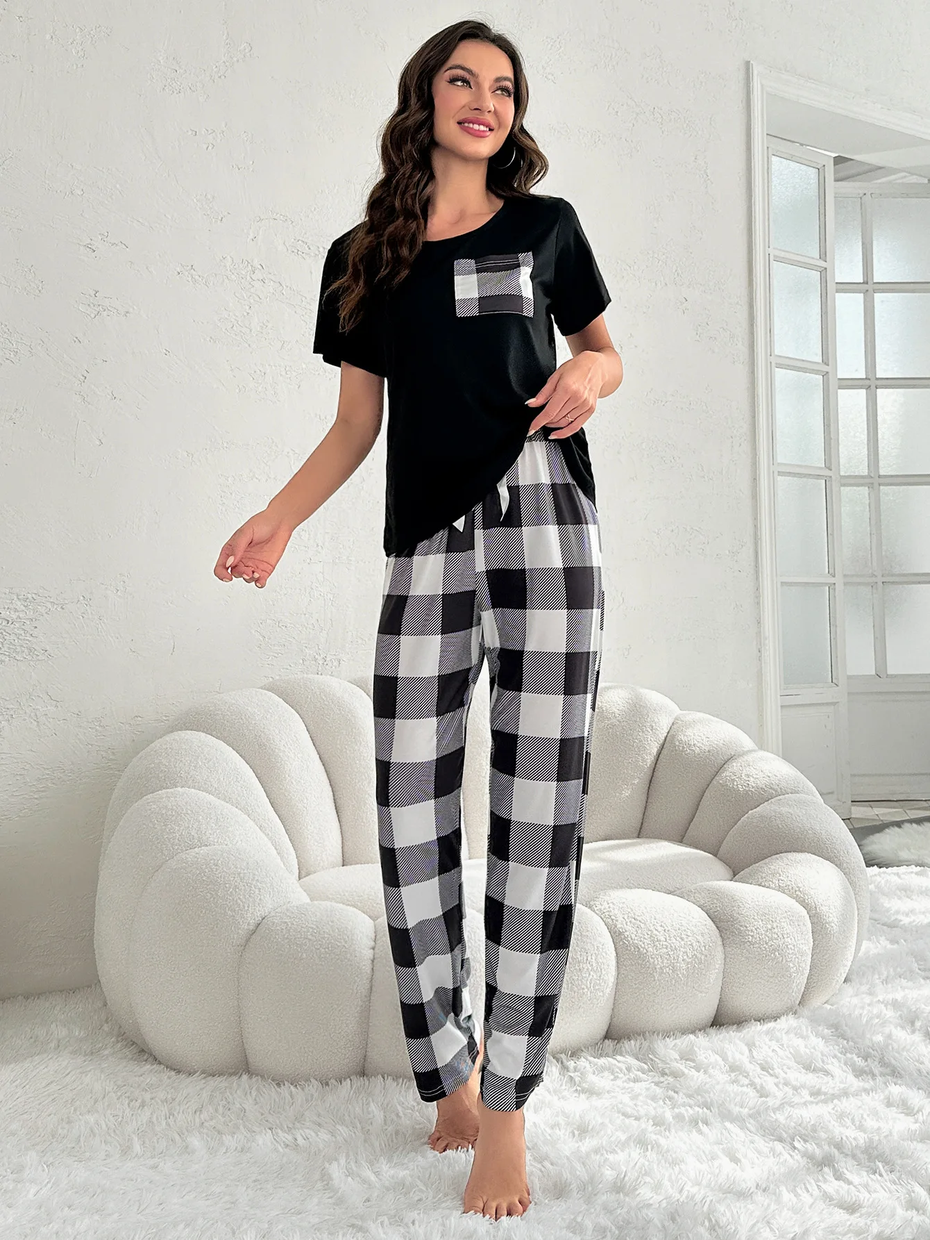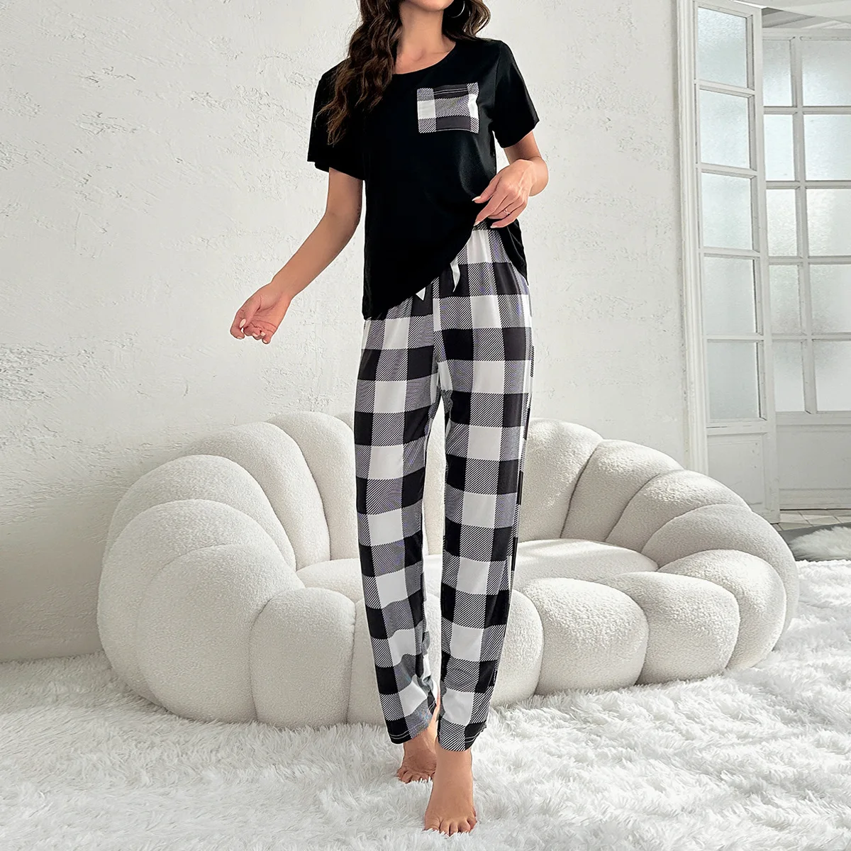 European American Cross-Border Women's Plaid Two-Piece Set Casual Comfortable Summer Homewear Pajamas Elastic Waist Pockets Thin