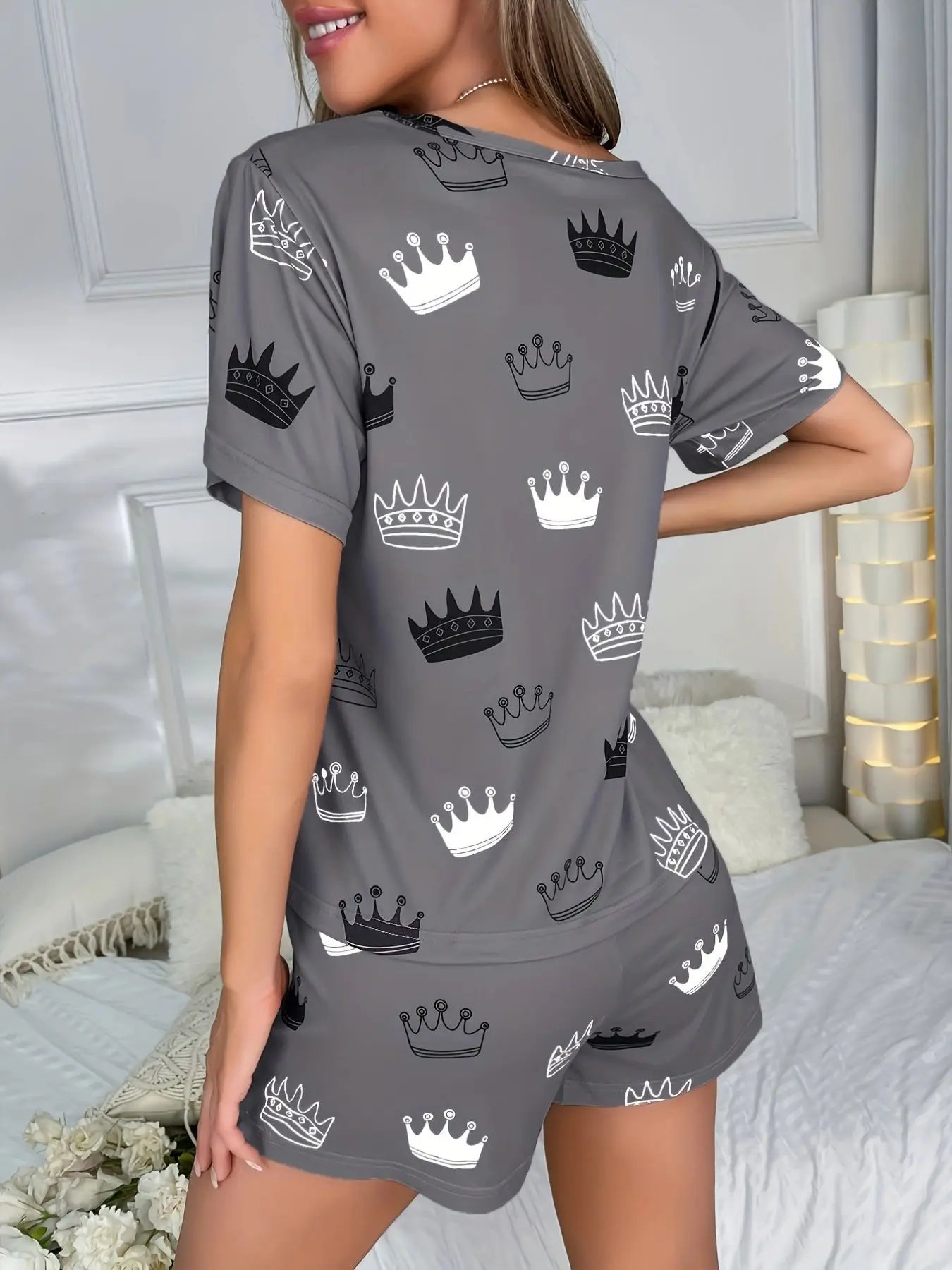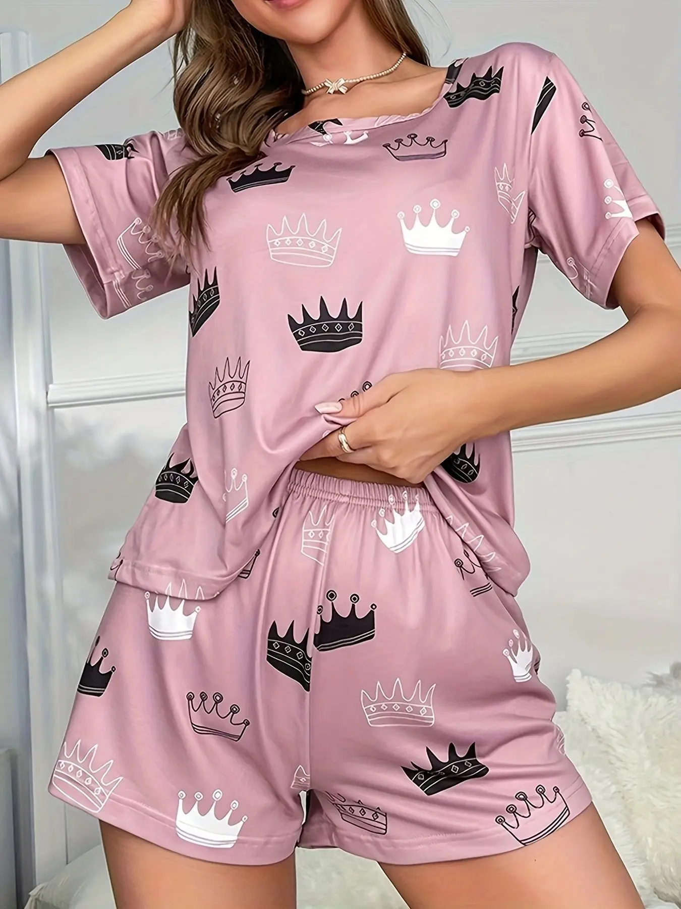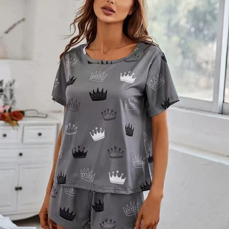 European American Women's Comfortable Casual Set Print Short Sleeve Milk Silk Pajamas Elastic Waist Summer