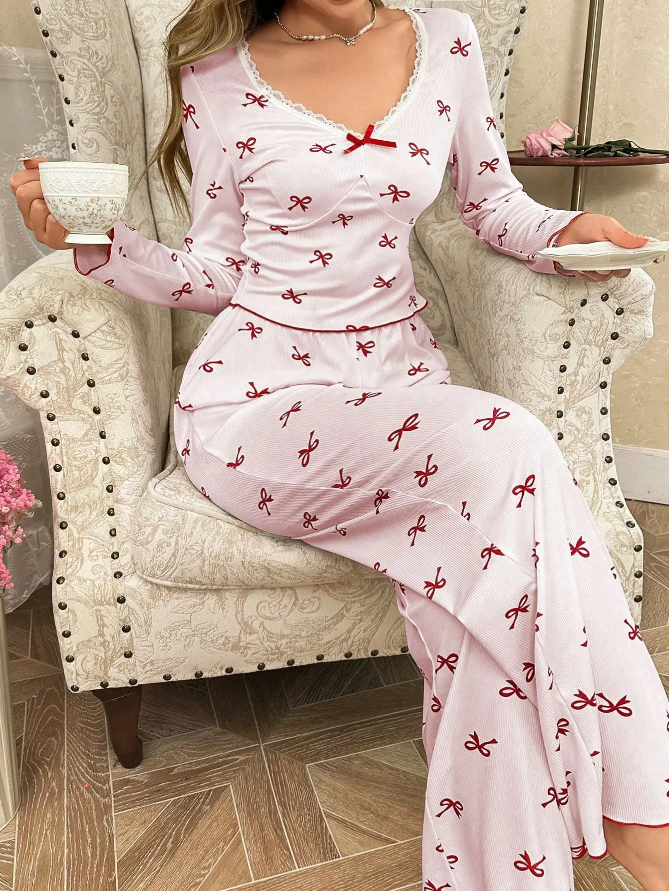 European and American Style Women's Pajamas with Bow Tie Long Pants Long Sleeves Printed Elastic Women's Loungewear