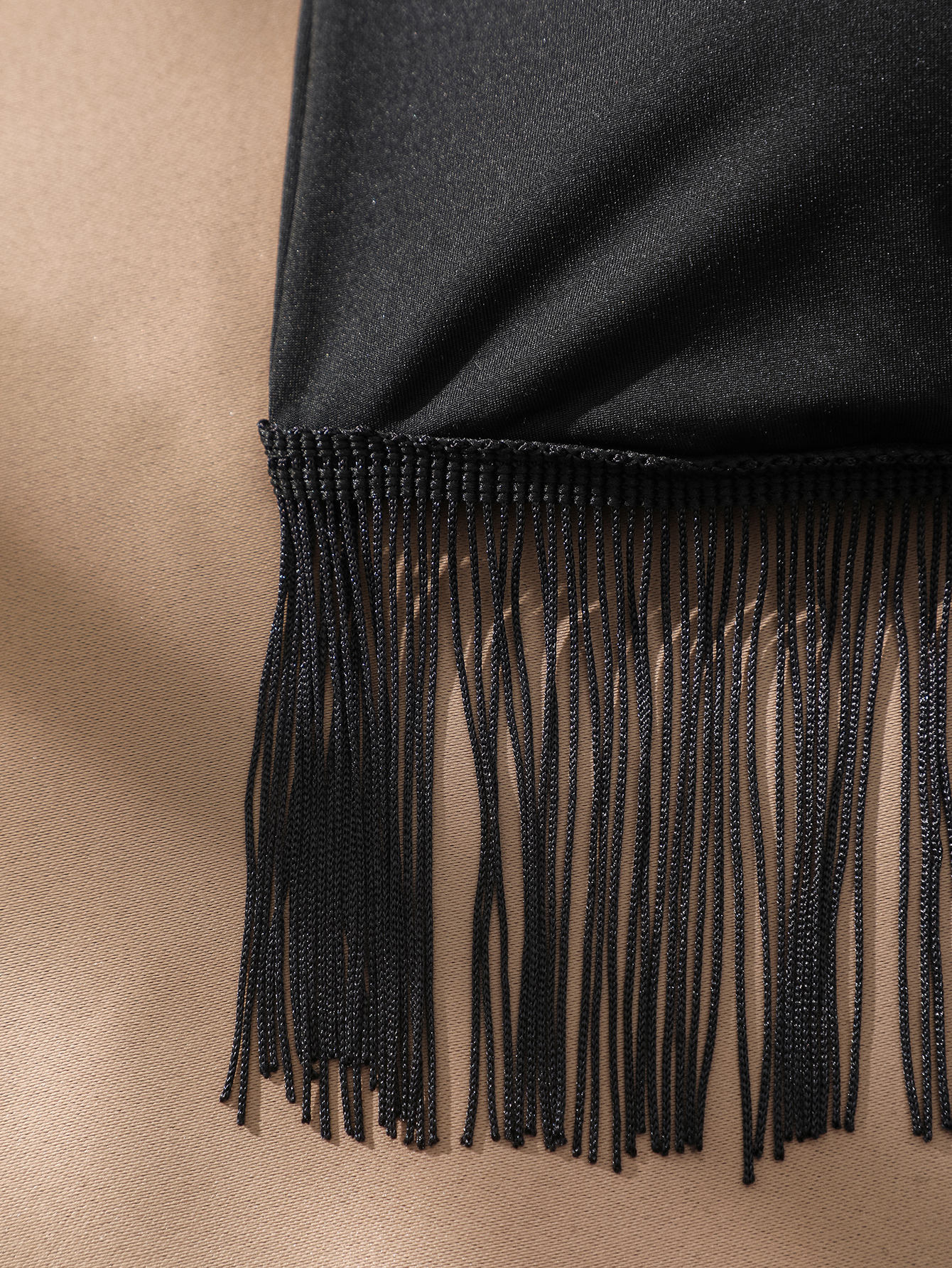Elevate your casual look with this trendy Fringe Hem Bandeau Crop Top, a perfect piece for summer festivals, nights out, or layering. Crafted from a smooth, figure-hugging black stretch fabric, this strapless bandeau design offers a comfortable and secure fit that highlights the shoulders and neckline. The standout feature is the playful, dramatic fringe trim adorning the hemline, which adds movement and a bohemian flair to the cropped silhouette. Pair it effortlessly with high-waisted shorts, skirts, or jeans for a bold and stylish ensemble that will turn heads.