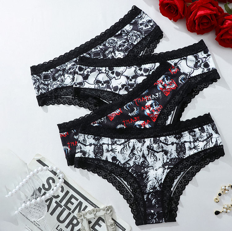 Edgy black hipster panties featuring a spooky skull/fang print and delicate black lace trim.