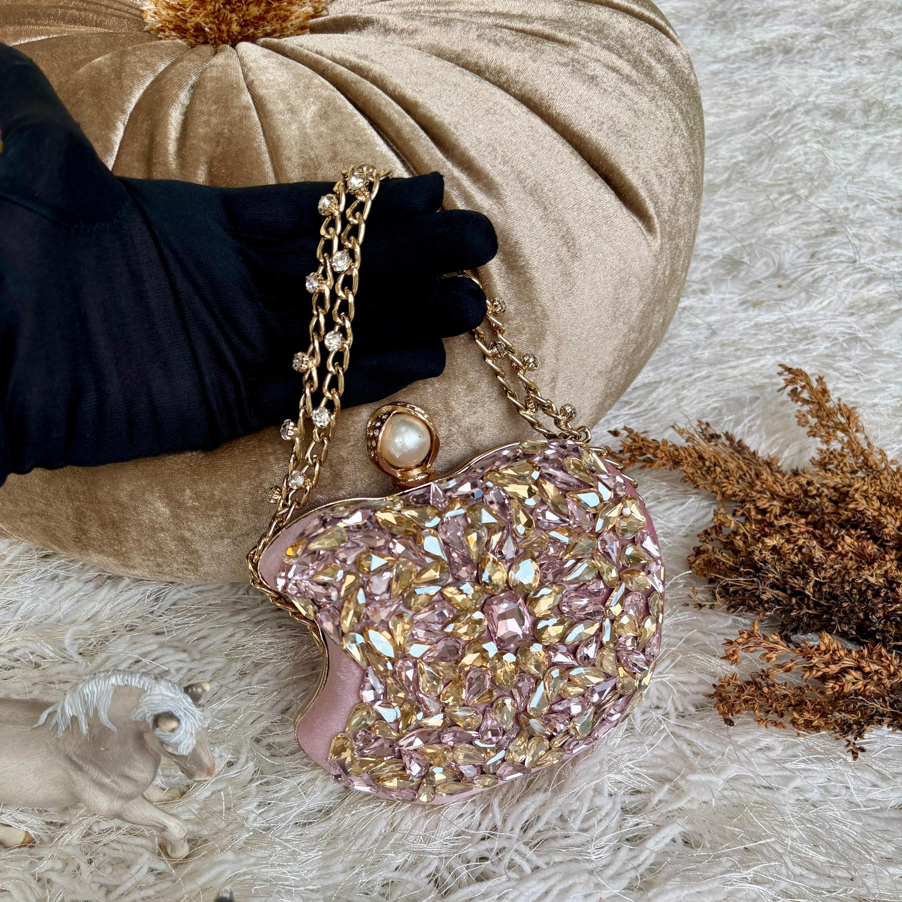 Make an unforgettable entrance with the HandCrafted Gem Apple Clutch. A luxurious twist on the classic novelty bag, this handcrafted piece features the playful apple shape but is entirely transformed by breathtaking, all-over embellishment.