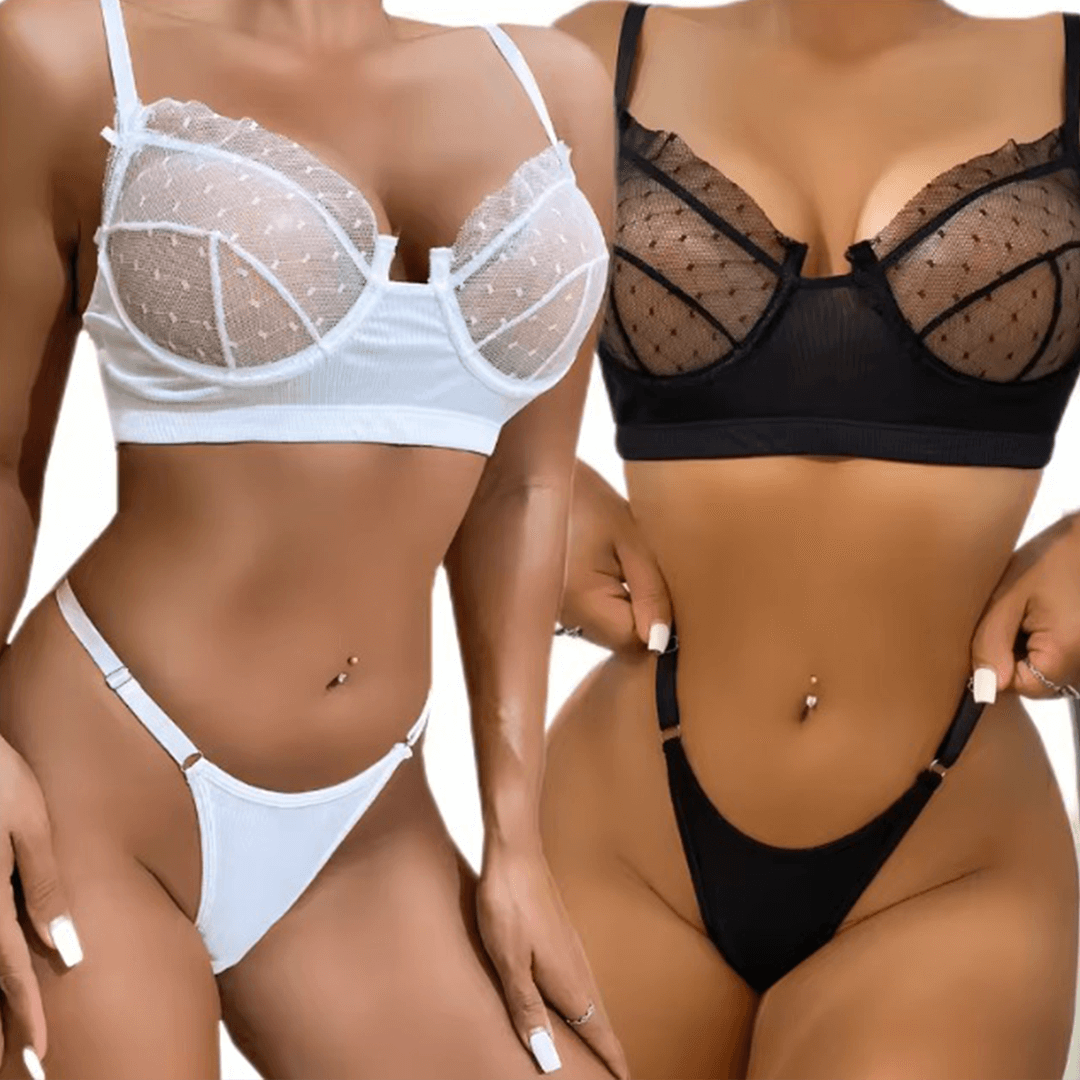 Featuring sheer, seductive mesh in both striking Black and angelic White options. The sets include an underwire bra for lift and support, paired with strappy, minimal coverage briefs. Perfect for turning up the heat and making any night unforgettable.