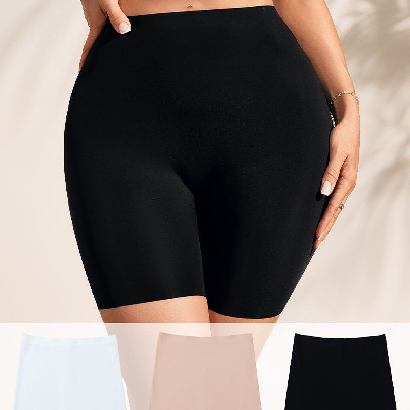 A pair of high-performance black safety shorts or bike shorts designed for complete invisibility and smoothing. The shorts...
