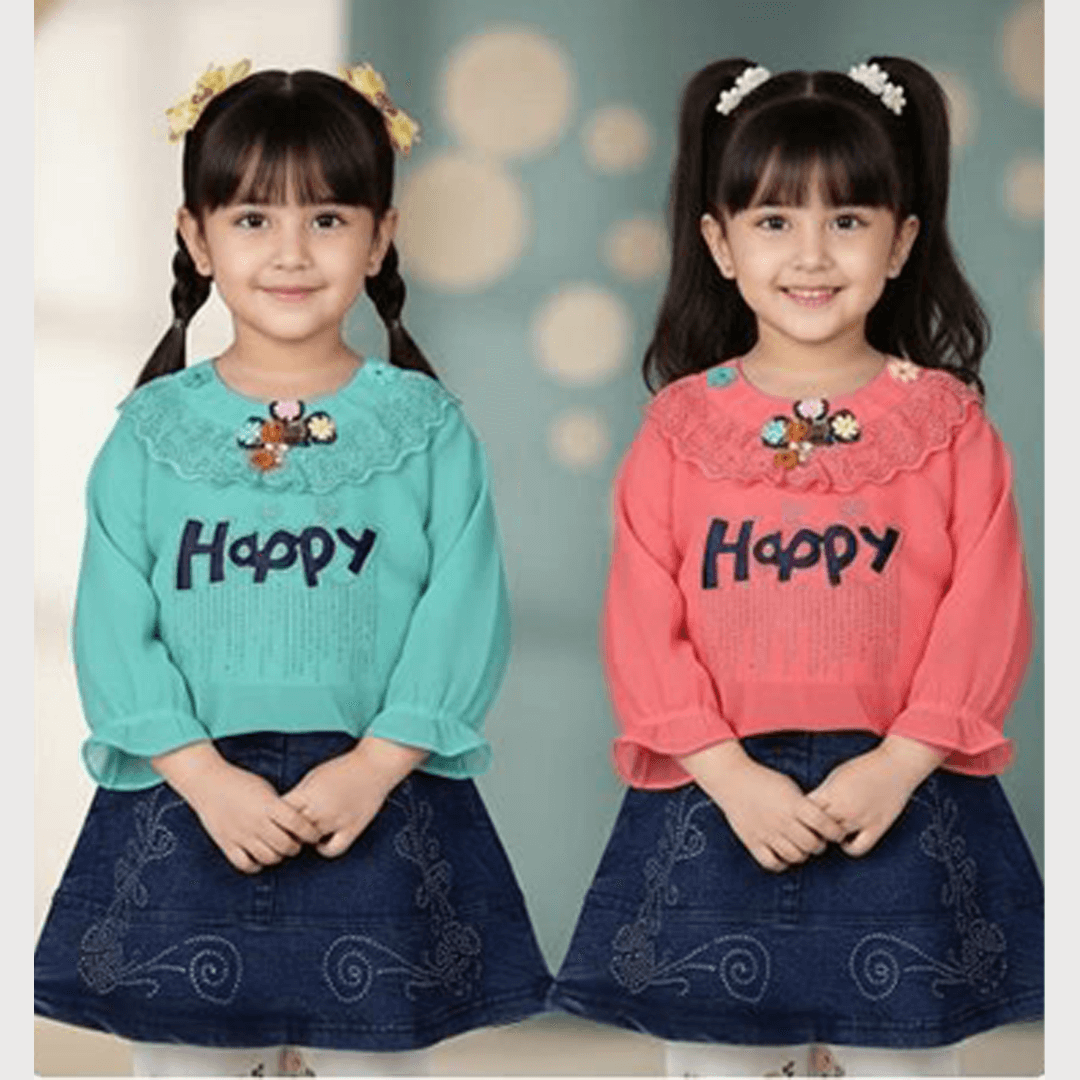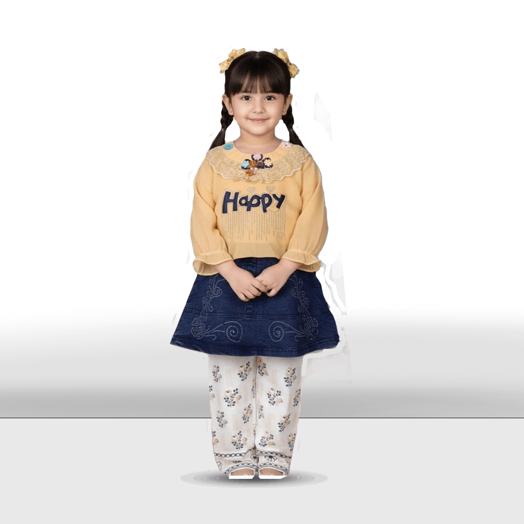A stylish three-piece layered outfit for a young girl. It features a sheer, mustard-yellow long-sleeve crop top with an embroidered lace collar and the word "Happy" printed on the front. This is layered over a denim mini-skirt with white stitching details. The set is completed with wide-leg cream-colored pants featuring a gentle floral print in blue and orange, creating a fun, mix-and-match look.