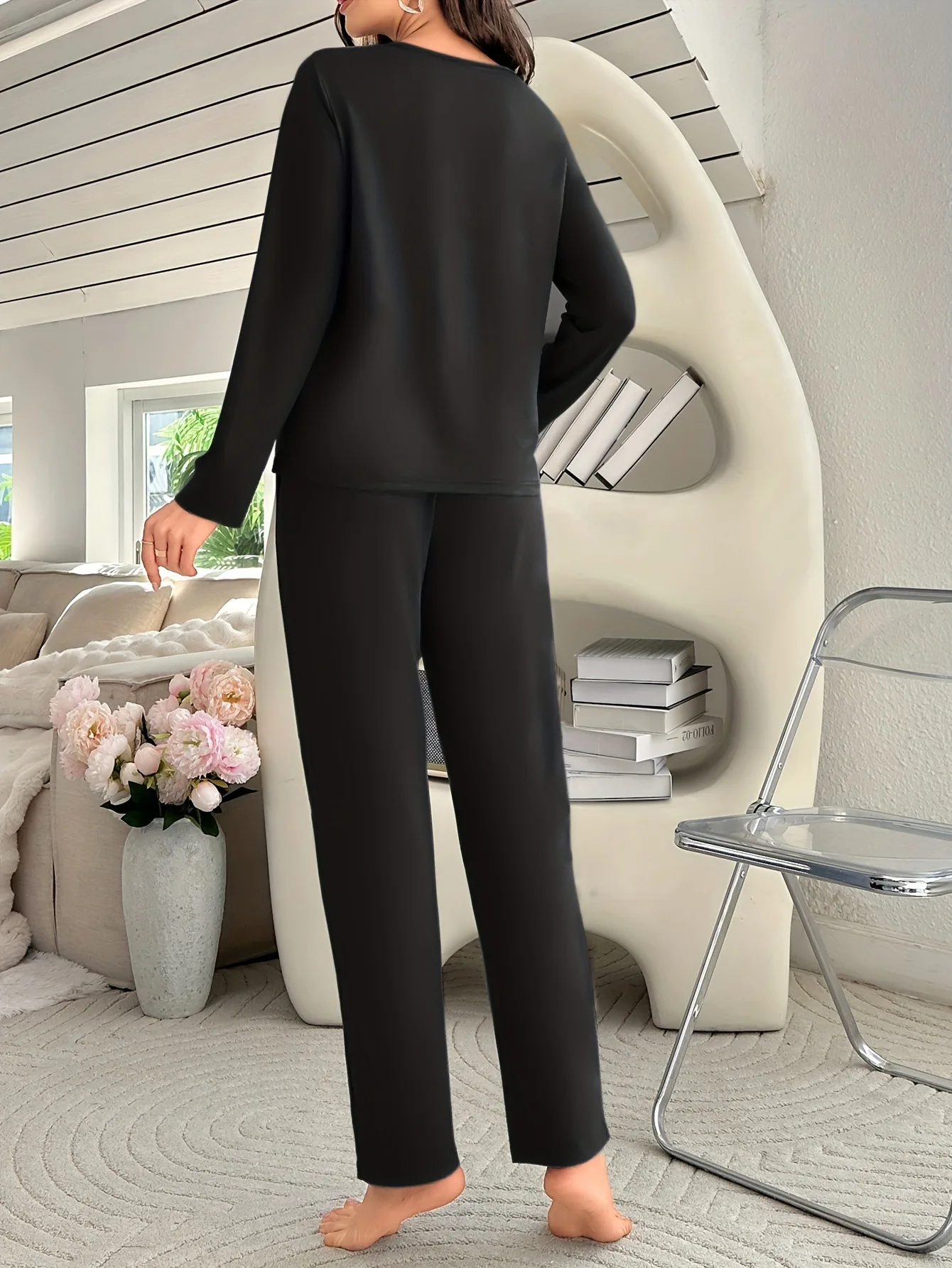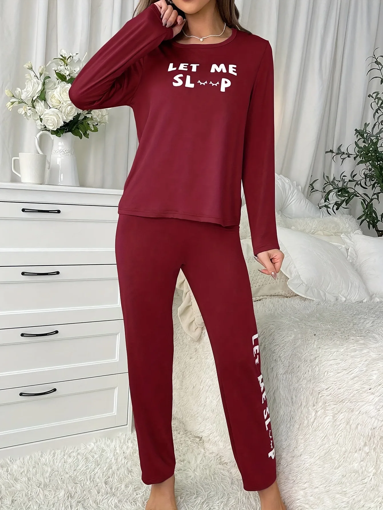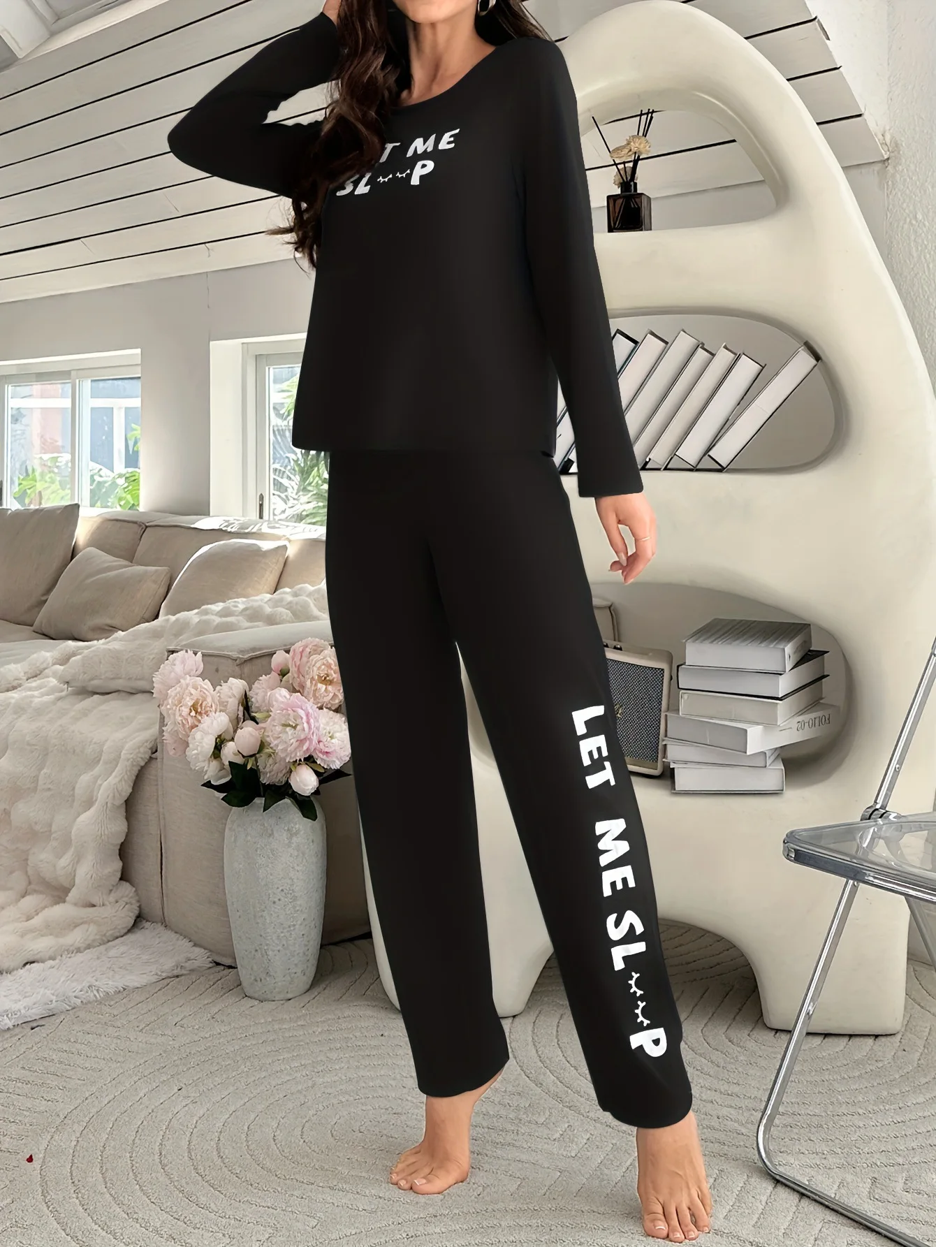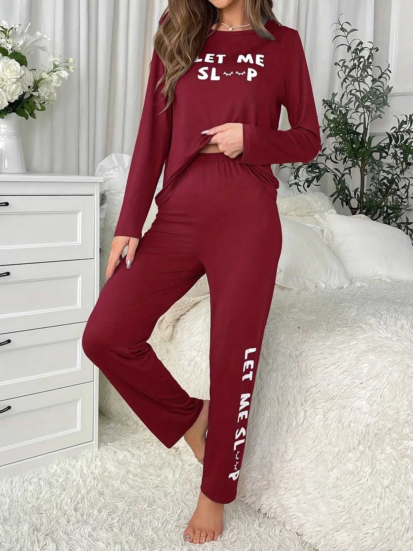 Letter Print Loungewear Two-Piece Set Elastic Waist Long-Sleeve Top Long Pants Casual Comfortable Front