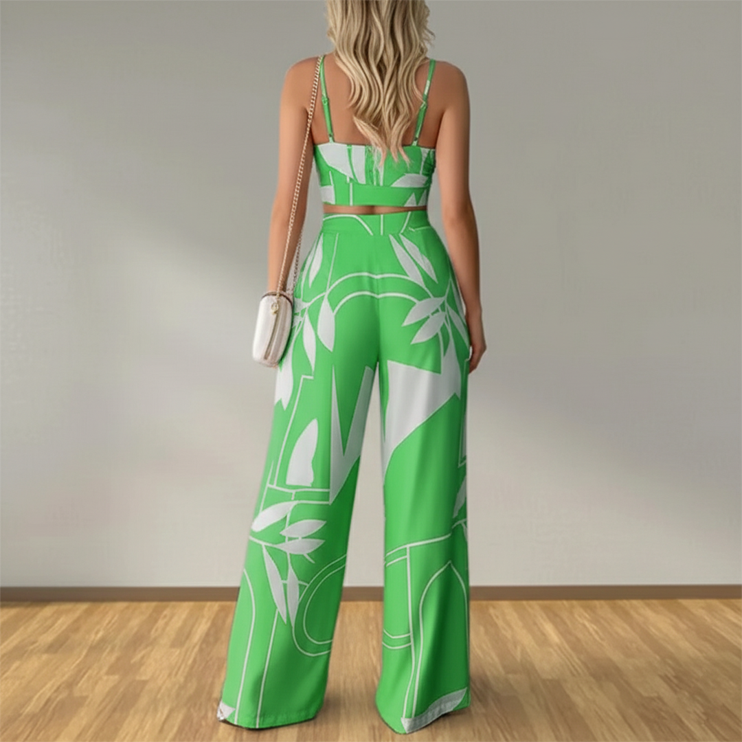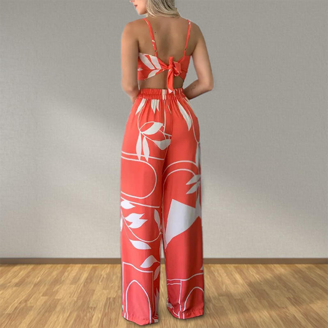 Embrace summer style with this New 2-piece Women Jump Set! It features a thin shoulder strap vest top with a playful front tie/lace-up detail and an elasticized back. Paired with high-waisted flowy wide-leg trousers, this outfit comes in bold, vibrant leafy prints (Black, Coral Red, and Light Green). Perfect for vacation, beach days, or casual weekend chic.
