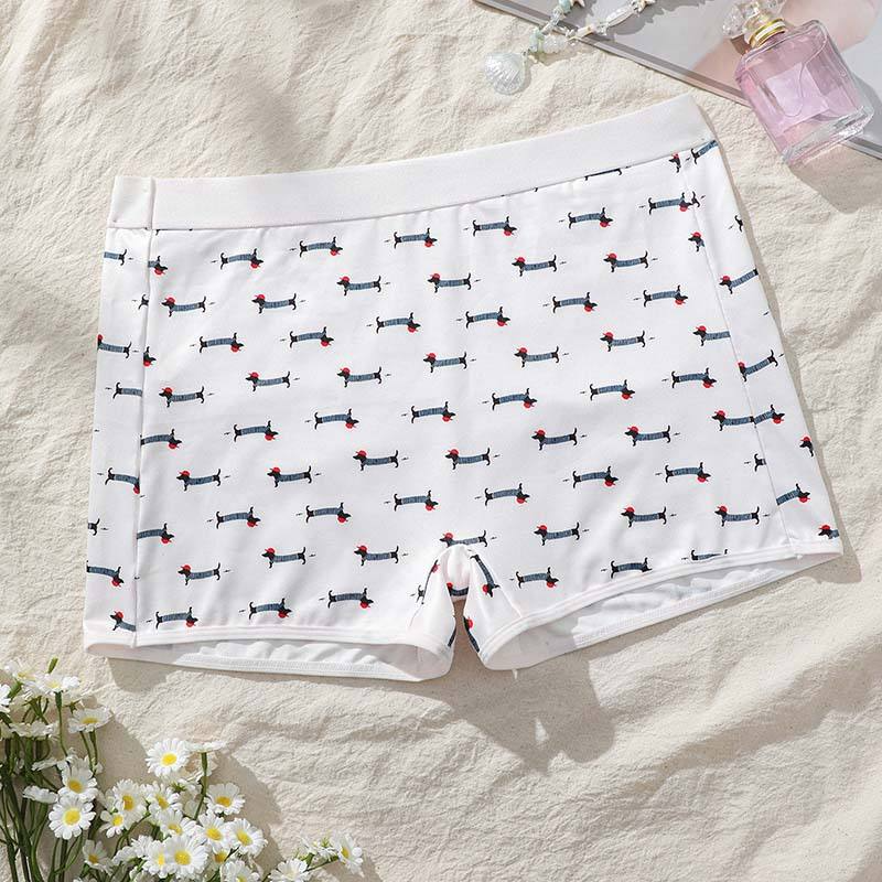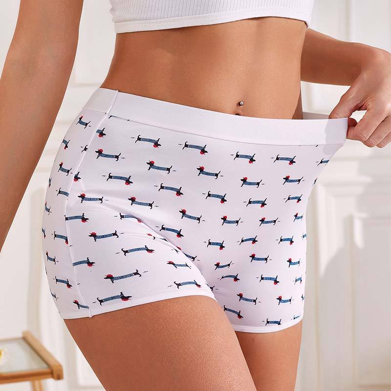 A comfortable and fun pair of shorts or boxer briefs for women, featuring a charming novelty print. The garment is made from a soft, stretchable fabric in white, ideal for lounging or wearing as comfortable underwear.