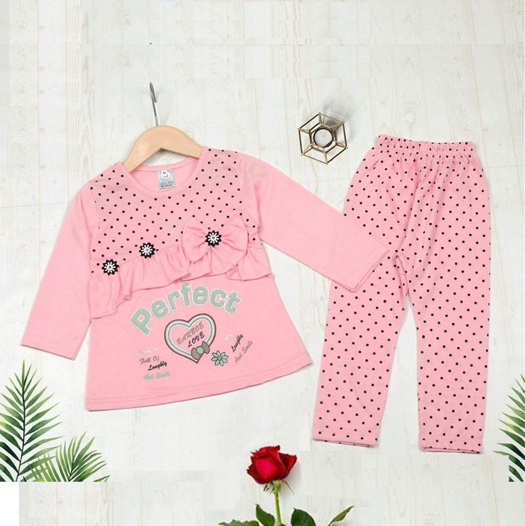 A cute and cozy two-piece outfit in soft pink with an all-over black polka dot pattern on the pants. The long-sleeved pink top features a black polka dot yoke panel and a large three-dimensional ruffle/bow detail on the chest with small floral appliques. A central graphic on the top reads "Perfect" above a heart with the text "Extreme Love". The matching polka-dot pants have a comfortable elastic waistband. This comfortable set could easily work as a casual play outfit or as stylish pajamas.