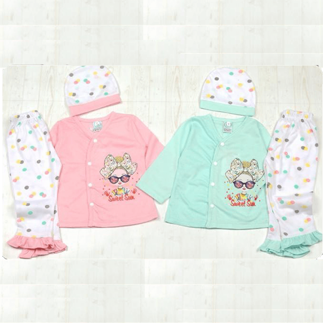 A bright and cheerful three-piece pajama or play set in sunny yellow and white. The set includes a long-sleeved yellow top that buttons up the front, featuring a large graphic of a girl with a bow and the text "Sweet Sun". The top is paired with white pull-on pants covered in a scattered multi-colored polka dot pattern. The pants have a sweet yellow ruffled hem at the ankle. Completing the set is a matching white cap with the same multi-colored polka dots, bordered in yellow, making it perfect for cozy comfort.
