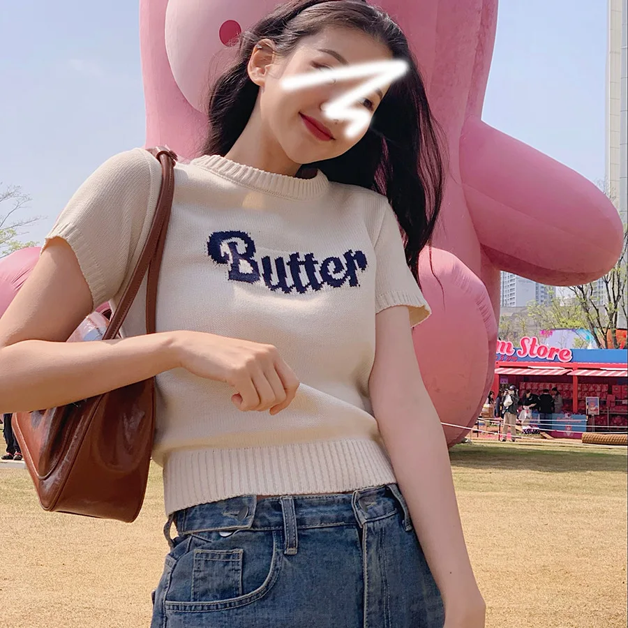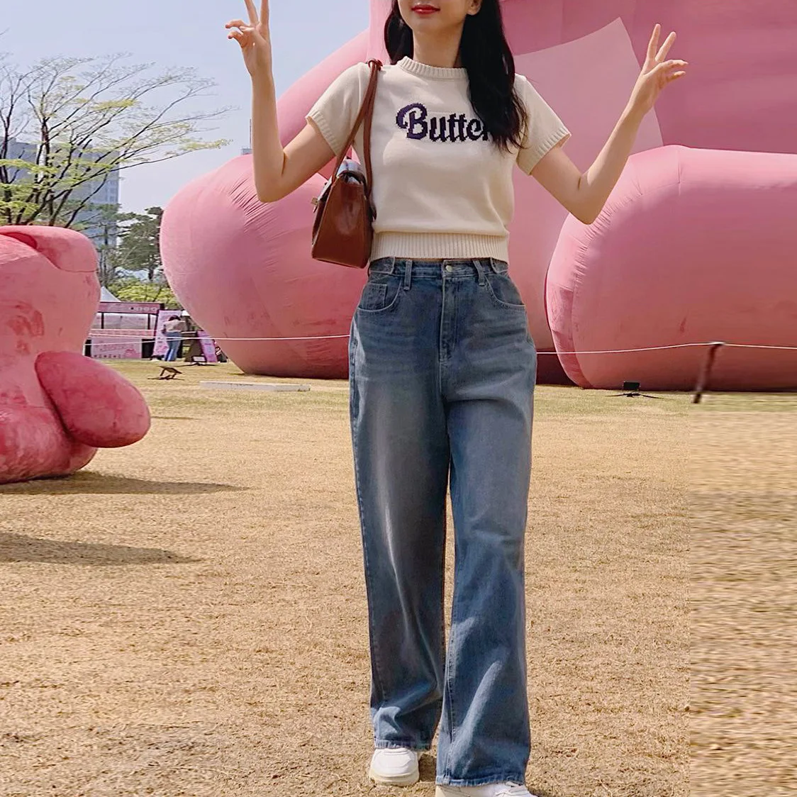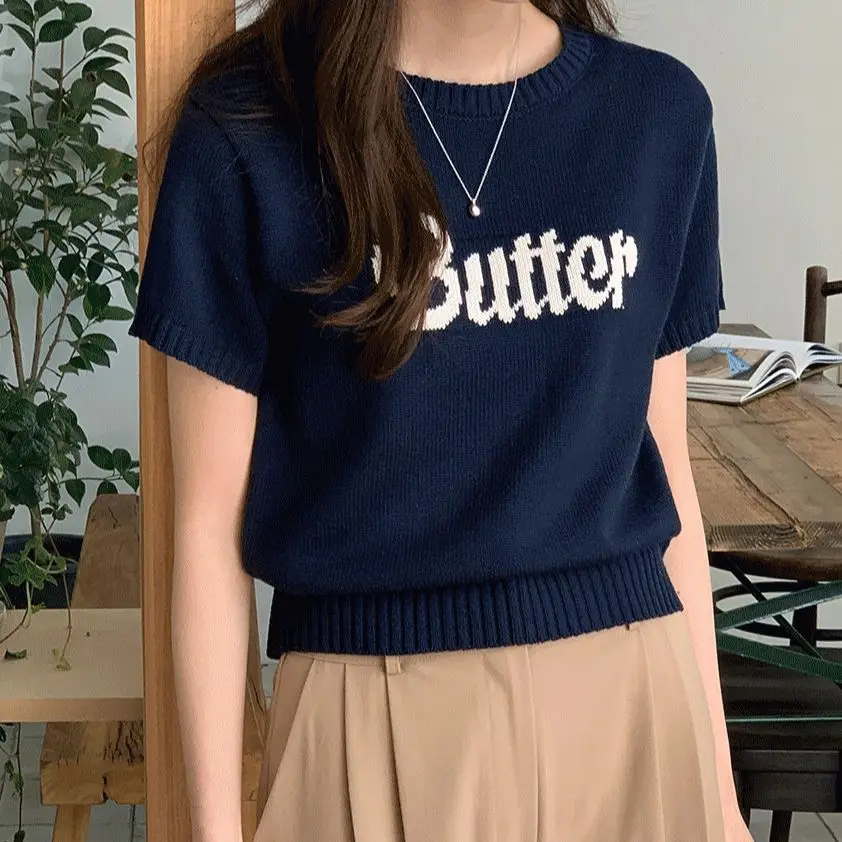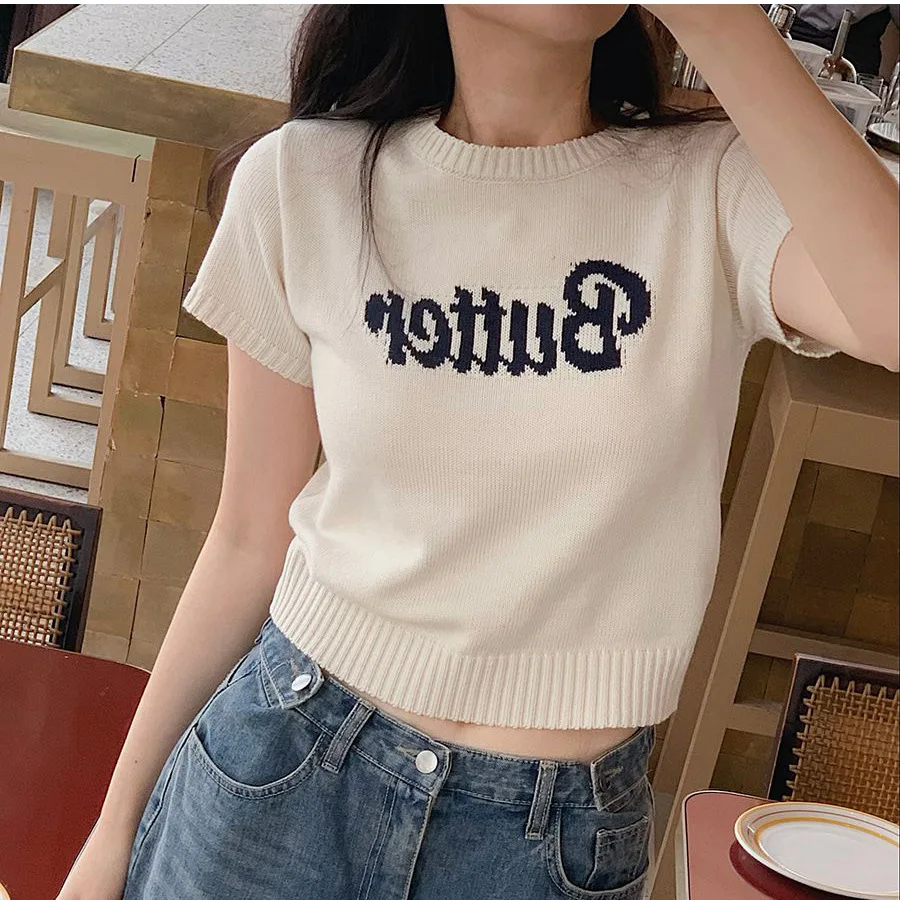 Printed round neck slim short T-shirt casual all-match ins cute age-reducing top pure American hot girls letter print