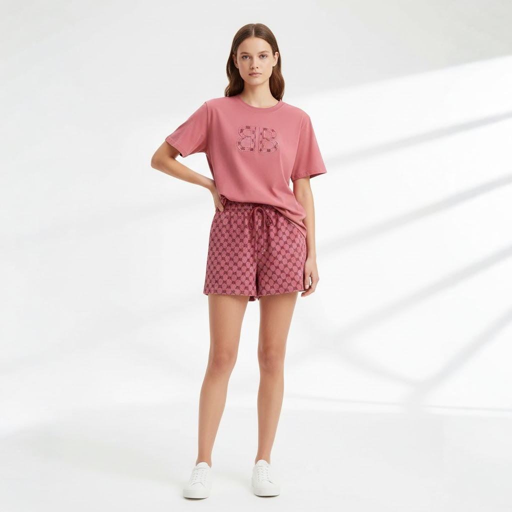 This matching two-piece set is designed for comfortable, casual wear, perfect for running errands, lounging, or a relaxed weekend look. The classic crew neck T-shirt features a prominent embroidered or textured letter emblem on the chest. The matching shorts boast an all-over monogram or check print, and a comfortable elasticated drawstring waist. Available in a variety of solid colors, this coordinated set offers an instantly put-together and chic athletic-inspired ensemble.