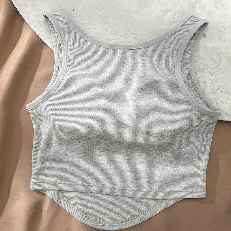 This stylish Ribbed Button-Placket Tank Top is a modern essential that combines comfortable fabric with a flattering, structured shape. It is crafted from a soft, fine vertical ribbed knit that ensures a stretchy, form-fitting silhouette. The top features a curved scoop neckline and a decorative partial button placket down the center front. The distinguishing feature is the chic, curved (corset-style) hemline that dips slightly in the front and back, perfectly complementing high-waisted bottoms. This versatile top is ideal for casual layering or wearing solo for a trendy, streamlined look.