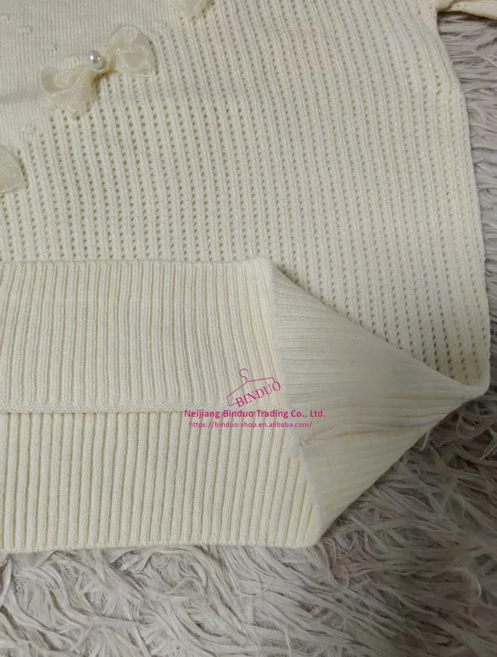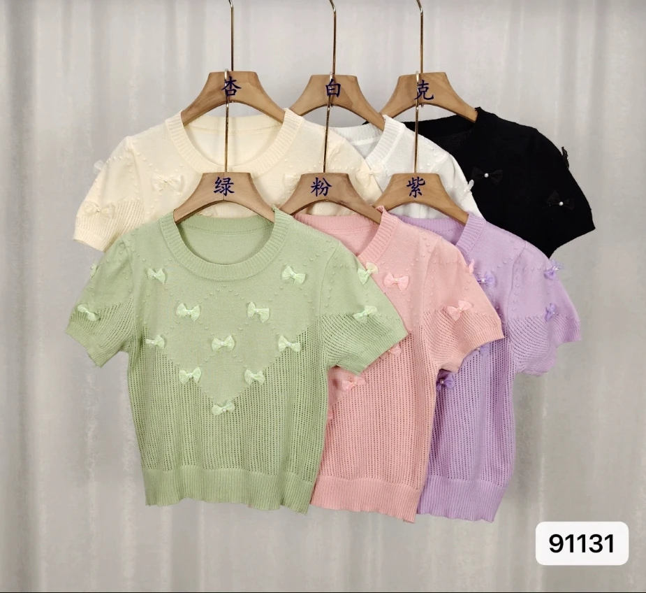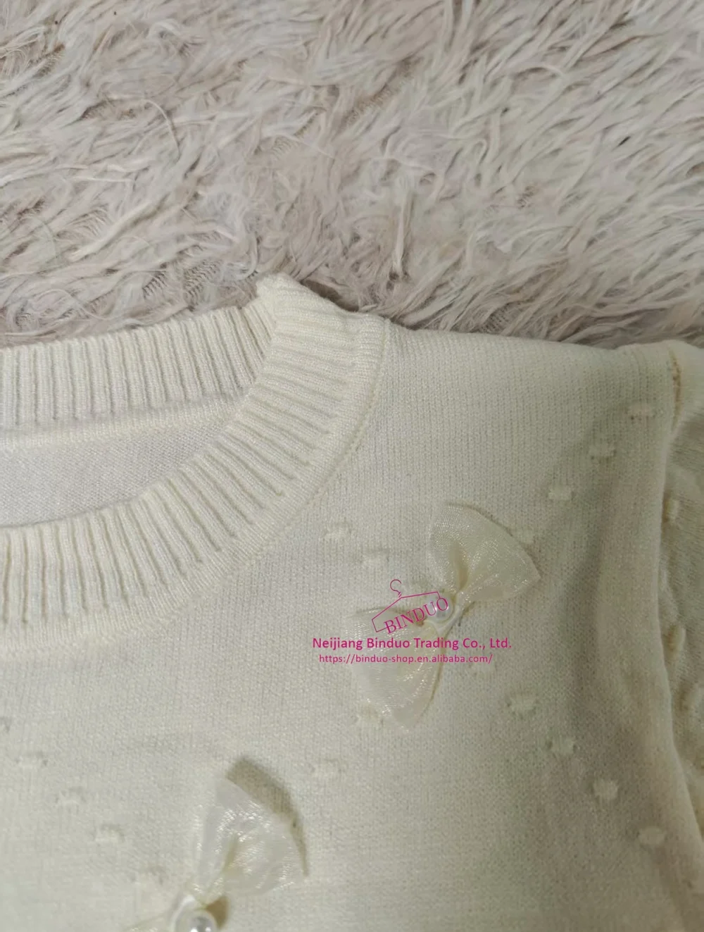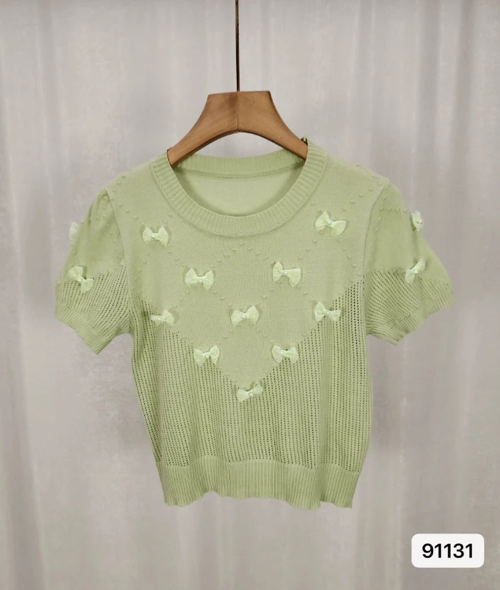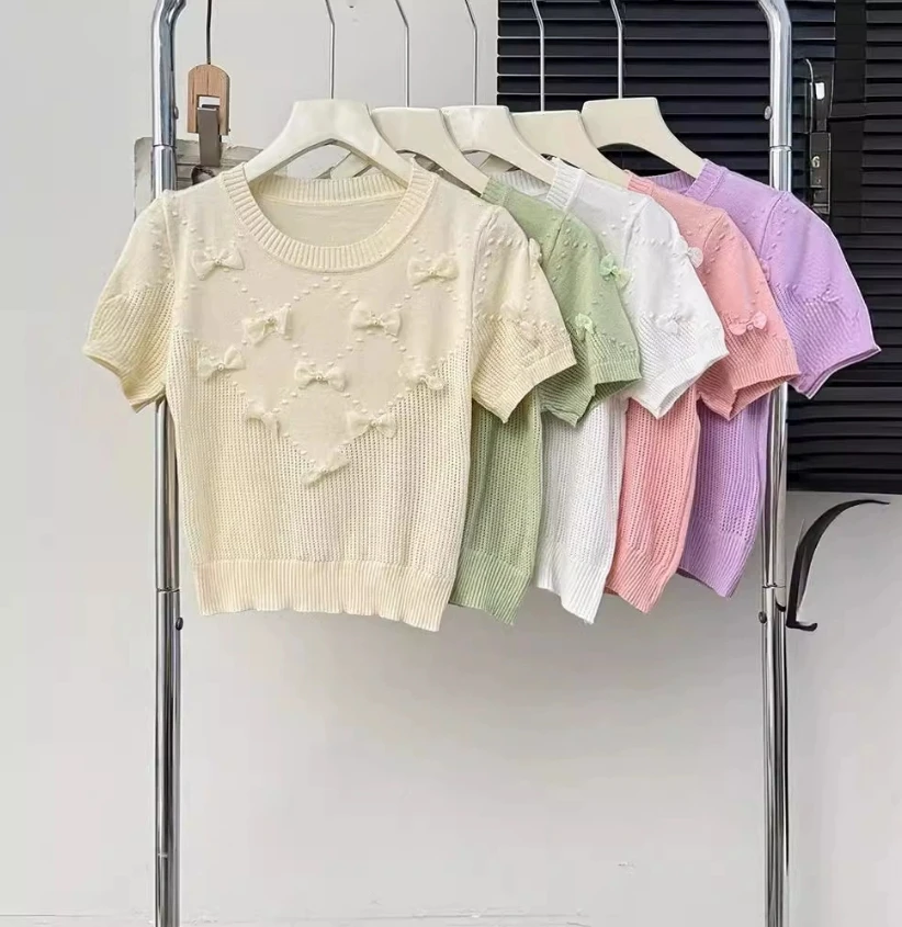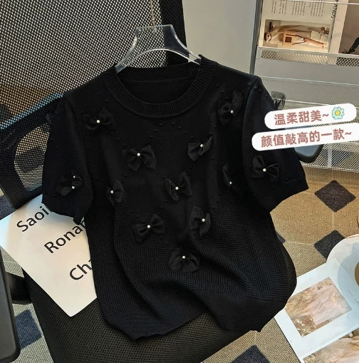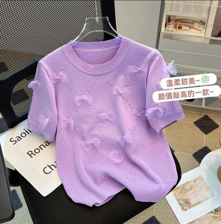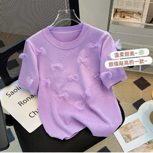 Round Neck Bow Short Sleeve Knitted T-shirt for Women New Summer Style Short-Sleeved Tee Knitted T-shirt